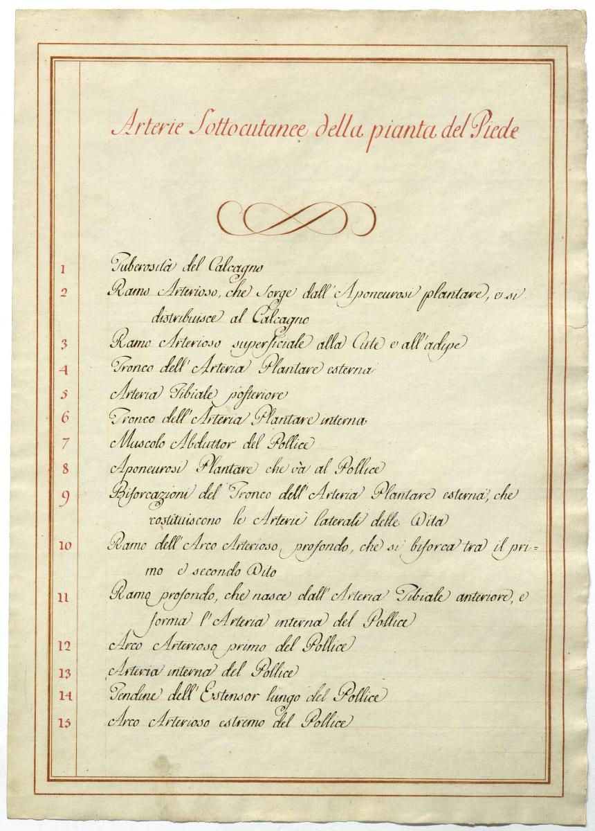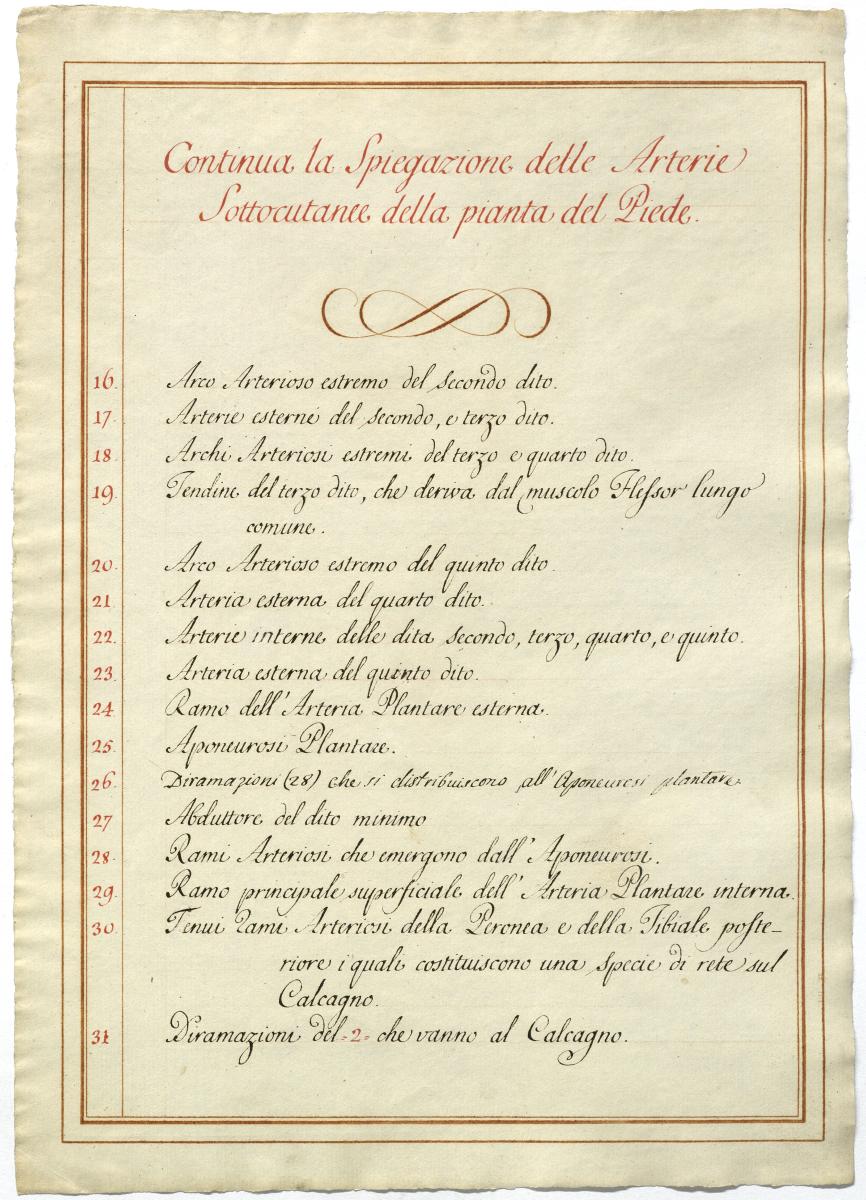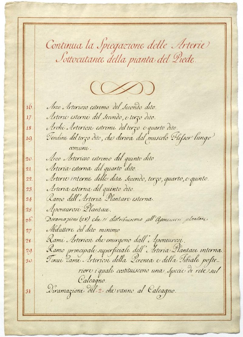 Der Text ist die ergänzende Beschreibung in italienischer Sprache zum anatomischen Wachsmodell der Fußsohlenarterie.