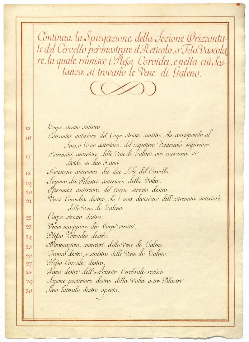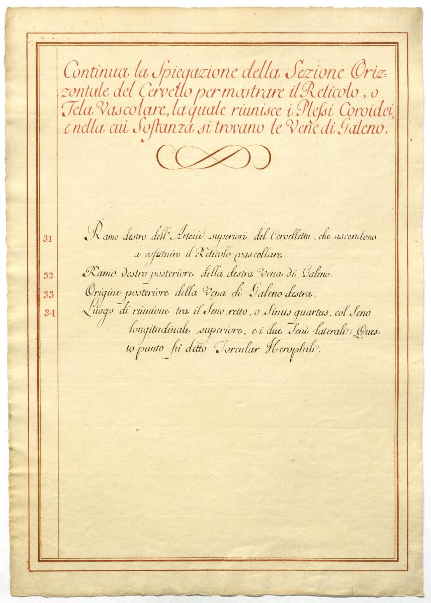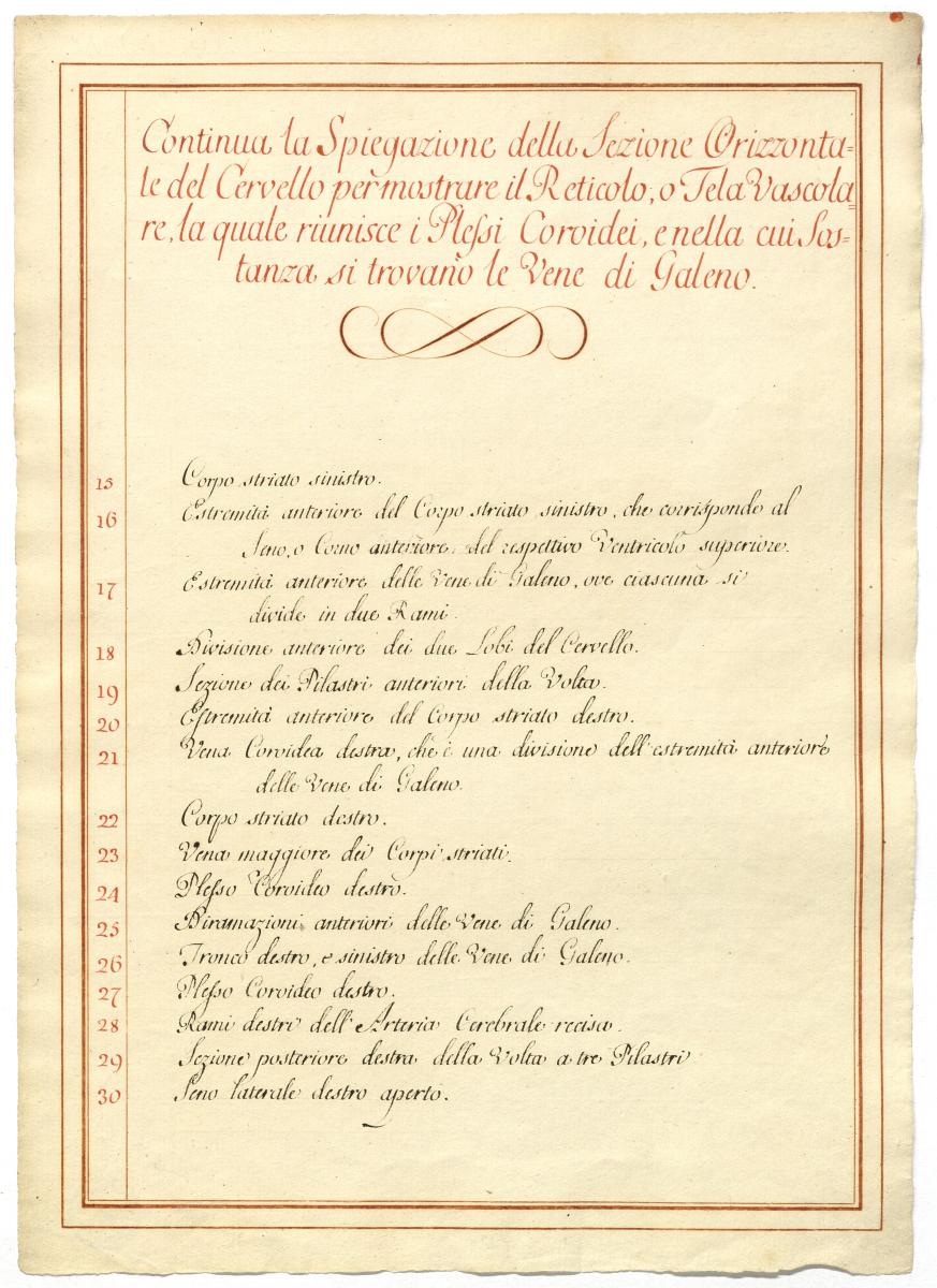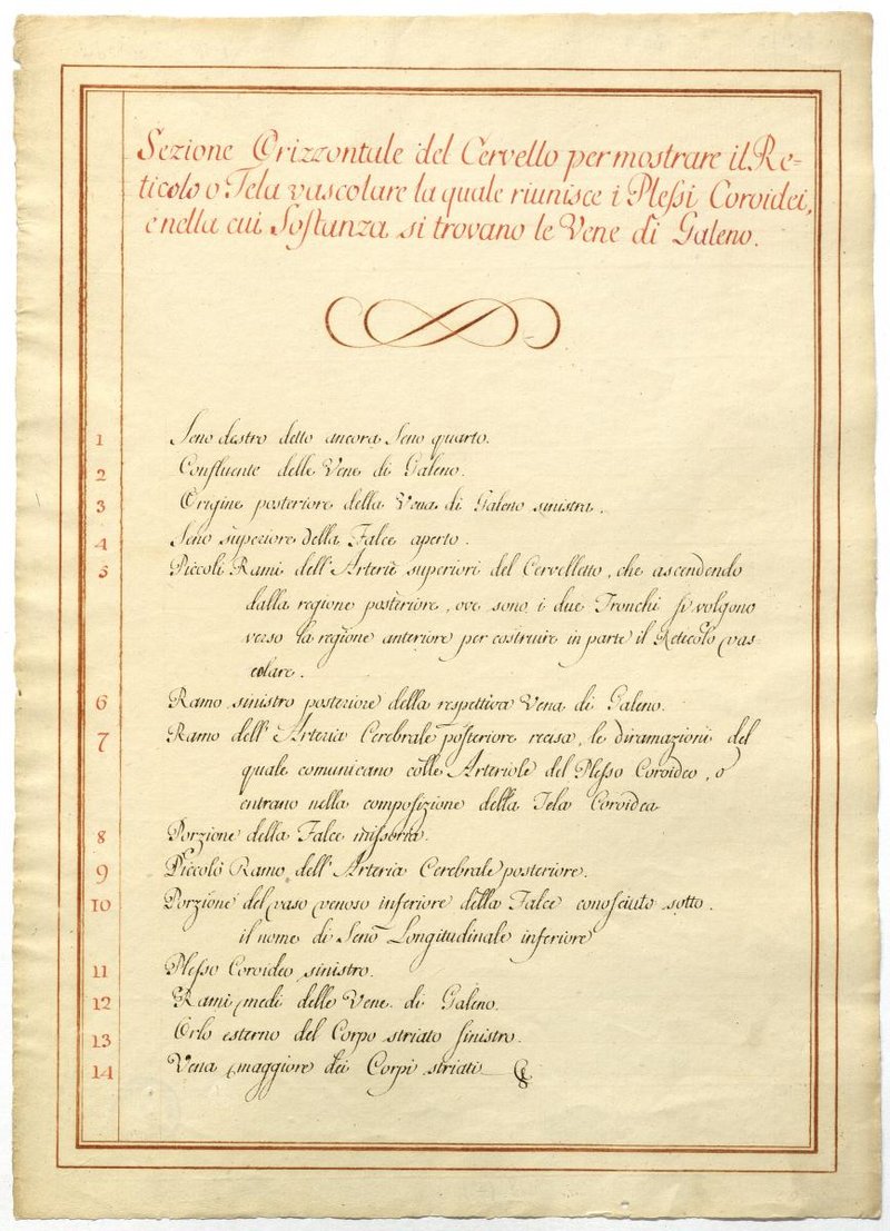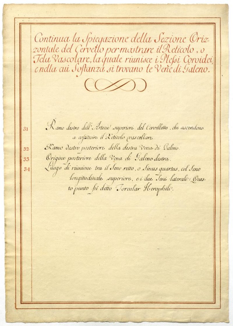 Der Text ist die ergänzende Beschreibung in italienischer Sprache zum anatomischen Wachsmodell des Hirnes.
