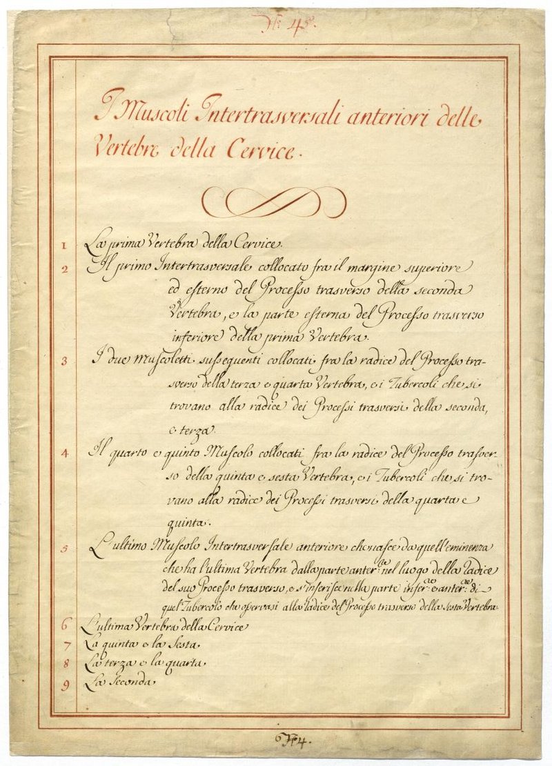 Der Text ist die ergänzende Beschreibung in italienischer Sprache zum anatomischen Wachsmodell der autochthonen Muskeln des Halses.