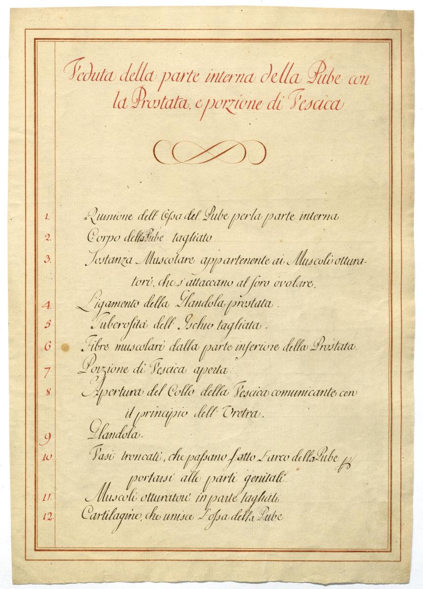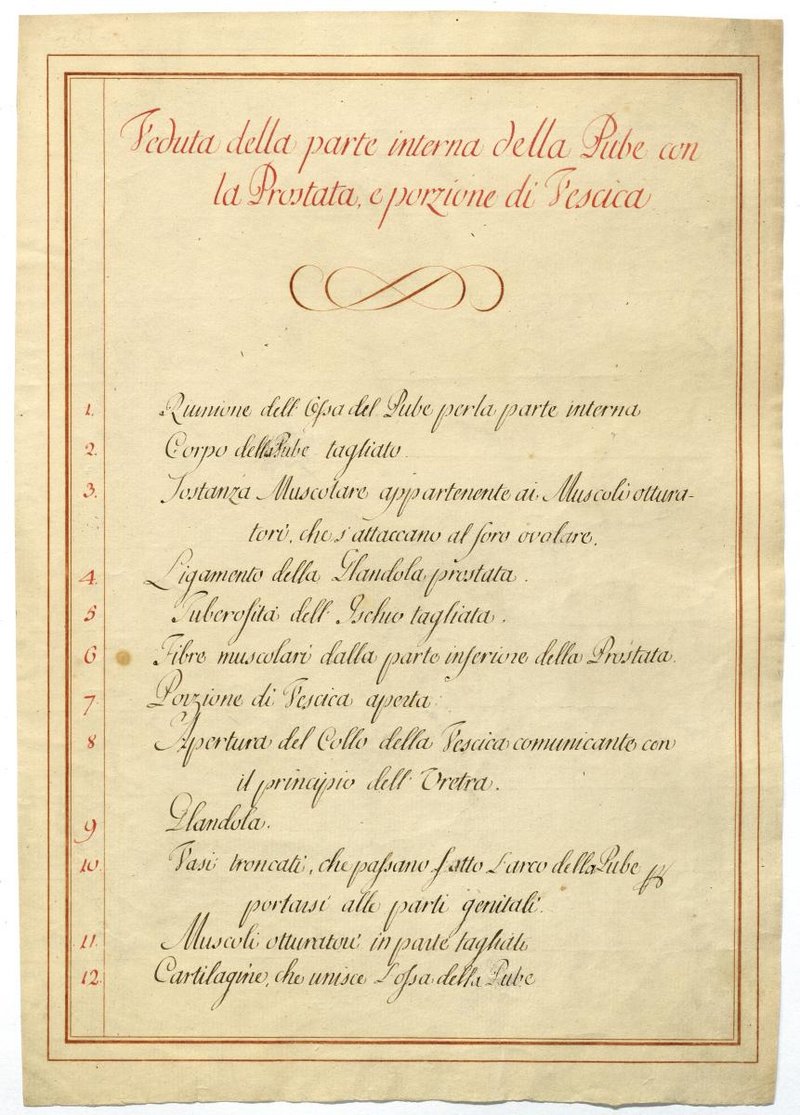 Der Text ist die ergänzende Beschreibung in italienischer Sprache zum anatomischen Wachsmodell der Harnblase und Harnröhre beim Mann.