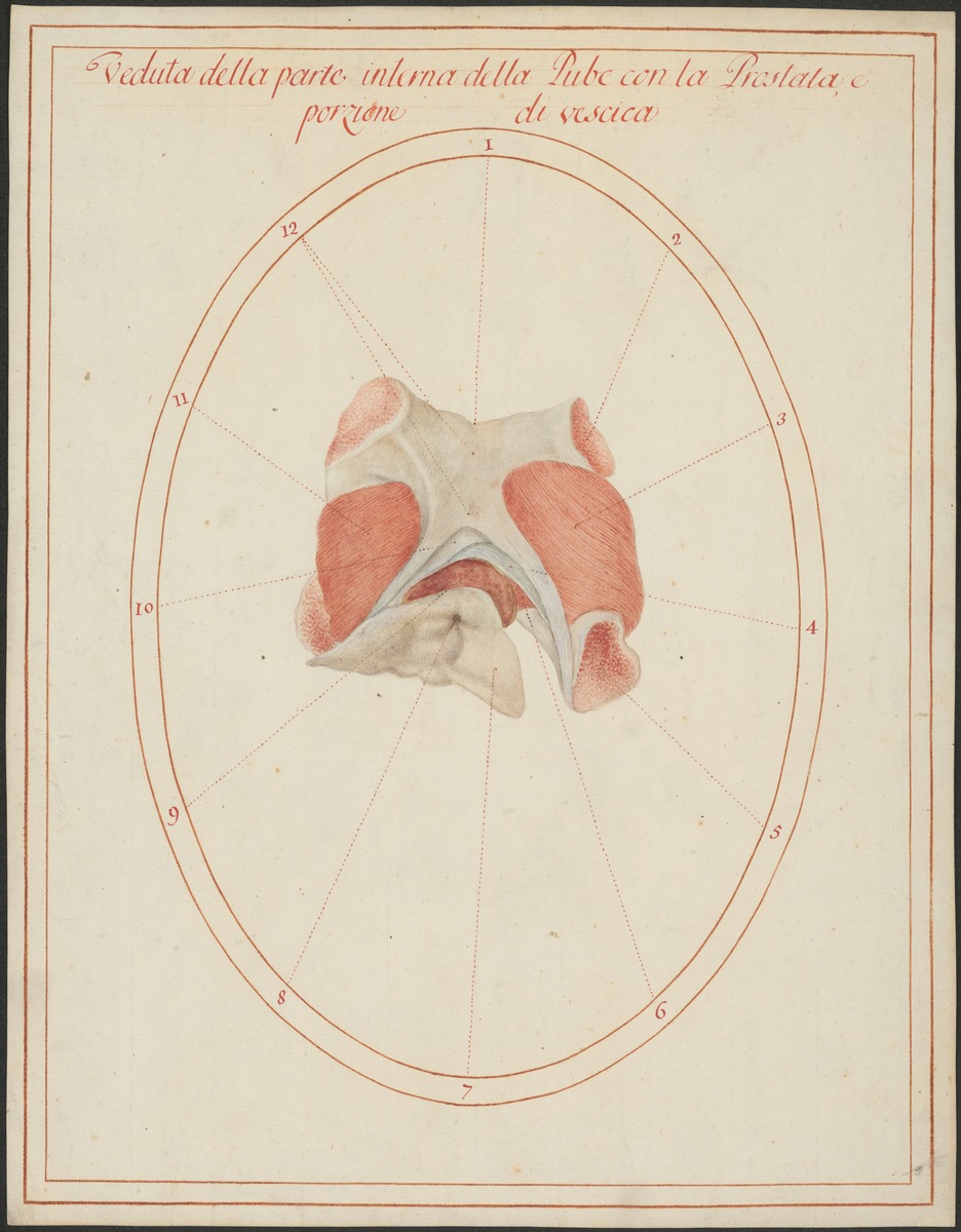 Zentrale Anteile der Schambeine (Ossa pubis) und die Schambeinfuge sowie die das Foramen obturatum bedeckenden Muskeln von innen. Die Vorsteherdrüse (Prostata), ein Teil der Harnblase (Vesica urinaria) und die innere Harnröhrenöffnung (Orificium urethrae internum).