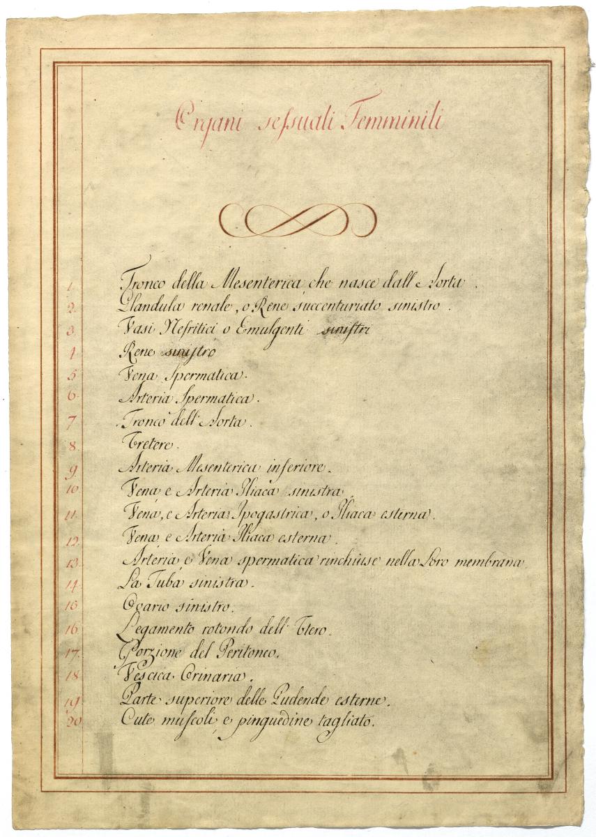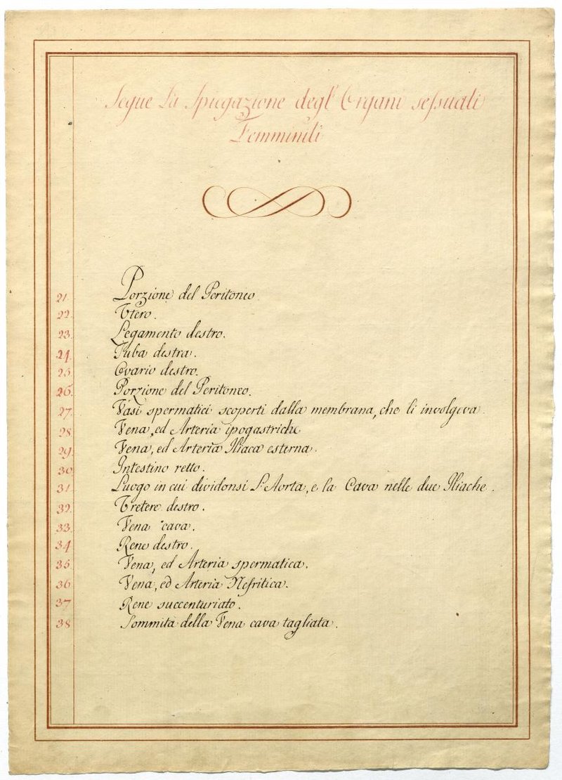 Der Text ist die ergänzende Beschreibung in italienischer Sprache zum anatomischen Wachsmodell der retroperitonealen und subperitonealen Organe der Frau.