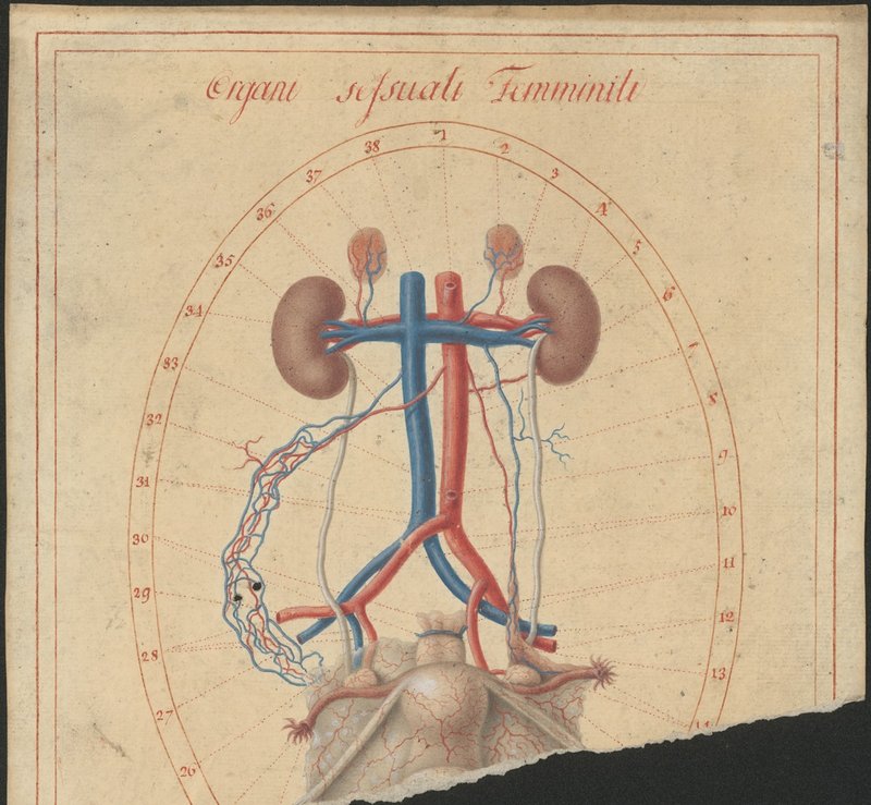 Isolierte Darstellung der weiblichen Harn- und Geschlechtsorgane (Organa urogenitalia feminina) sowie Nebennieren (Glandulae suprarenales) und ihre Blutgefäße inklusive deren Anbindung an den Zufluss über die Hauptschlagader (Aorta) bzw. Beckenarterien und an den Abfluss über die untere Hohlvene (Vena cava inferior) bzw. Beckenvenen.