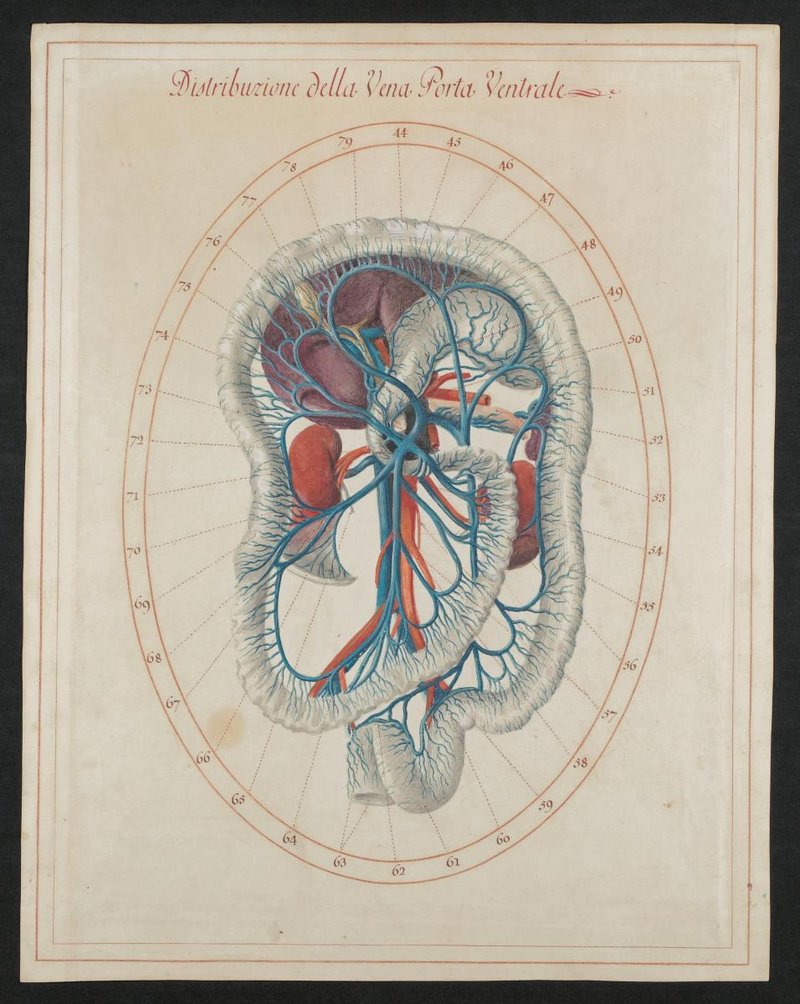 Entnommenes Organpaket, der Dünn- und Dickdarm ist entleert und kontrahiert dargestellt. Die Bildung der Pfortader (Vena portae hepatis) aus den Venen der Verdauungsorgane und die retroperitonealen Einmündungen in die untere Hohlvene (Vena cava inferior) sind dargestellt.