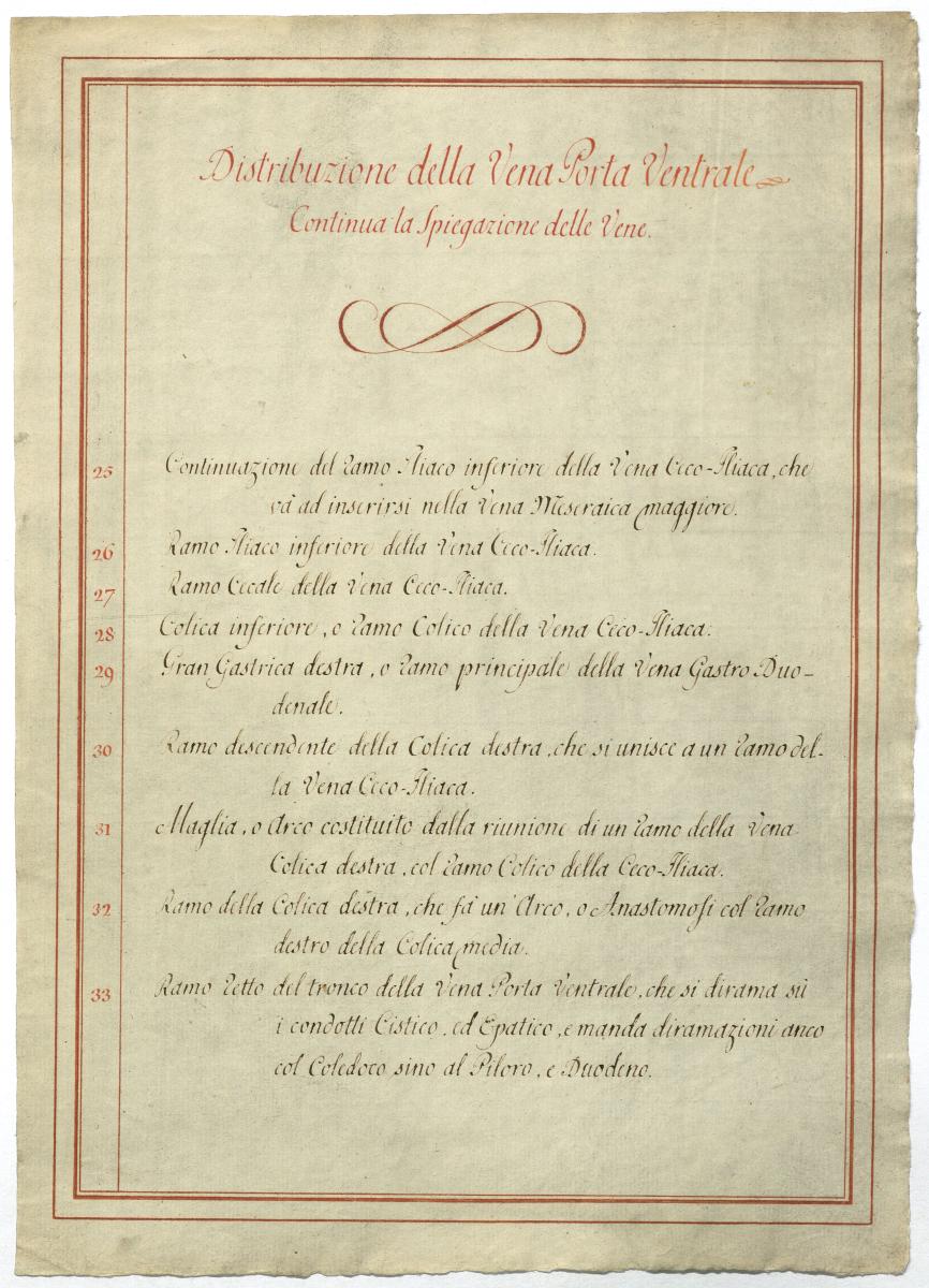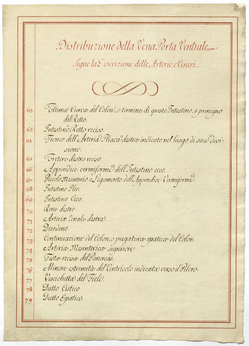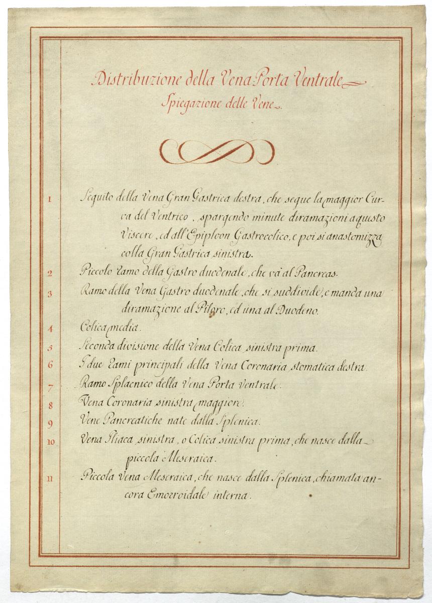 Der Text ist die ergänzende Beschreibung in italienischer Sprache zum anatomischen Wachsmodell der Pfortader.