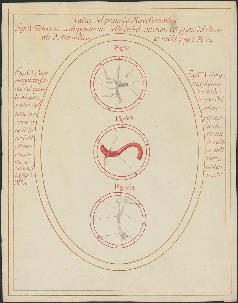 Fig. 5: 277/5: Die Wurzeln des ersten Spinalnerven (Nervus spinalis cervicalis I.) und die Beziehungen dieses Nerven zum 11. Hirnnerven (Nervus accessorius). Fig. 6: 277/7: Varietät, bei der einige Wurzeln des 11. Hirnnerven (Nervus accessorius) durch die Wirbelarterie (Arteria vertebralis) zu ziehen scheinen. Fig. 7: 277/6: Die Wurzeln des ersten Spinalnerven (Nervus spinalis cervicalis I.).