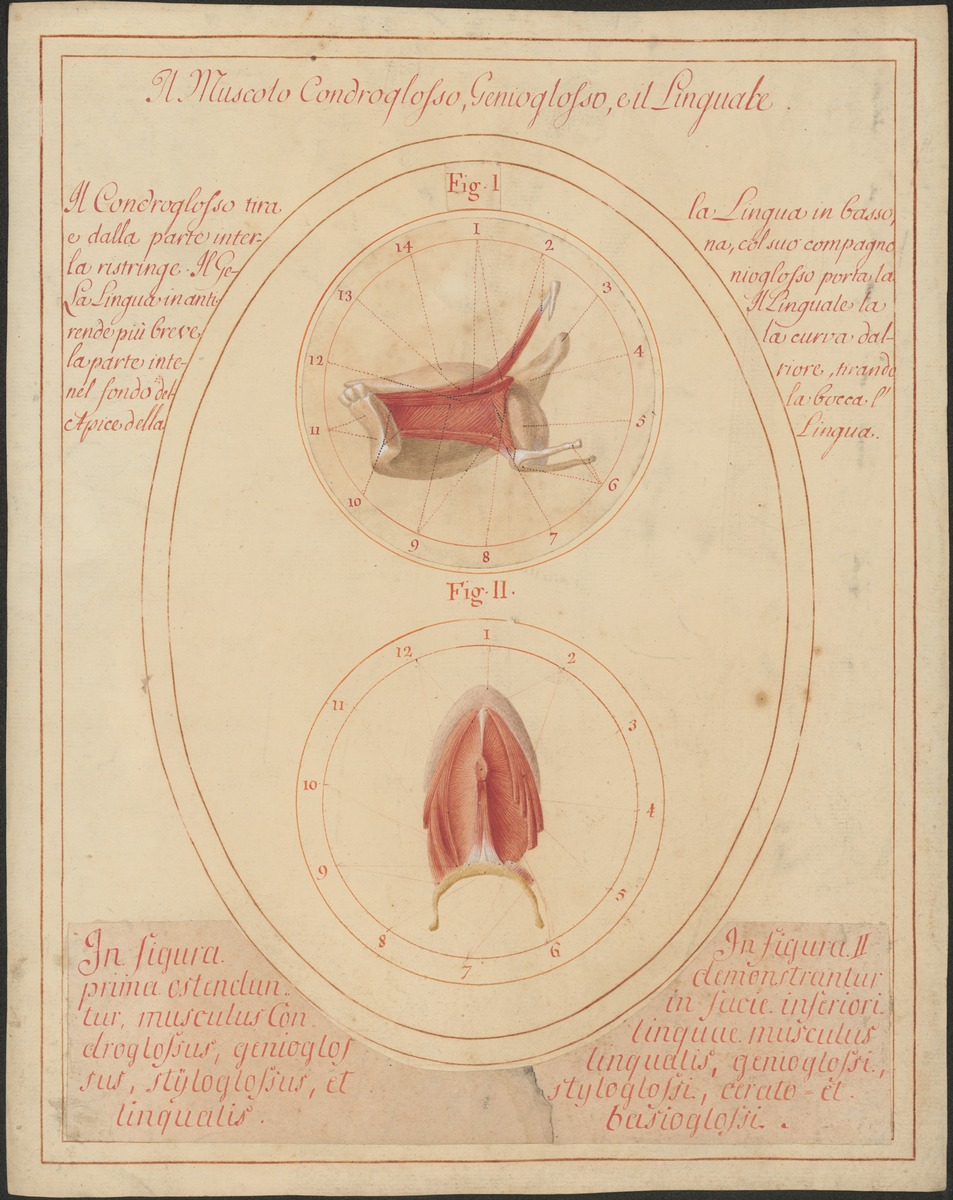 Fig: 1: 31/3: Isoliertes Modell des linken Proc. styloideus, der rechten Unterkieferhälfte inklusive Zunge und des Zungenbeins – es Musculus hyoglossus, Musculus genioglossus, Musculus longitudinalis und Musculus geniohyoideus dargestellt. Fig. 2: 31/2: Isoliertes Modell der Zunge und des Zungenbeins von unten mit den in sie einstrahlenden Muskeln: Musculus genioglossus, Musculus styloglossus, Musculus hyoglossus und Musculus longitudinalis inferior.