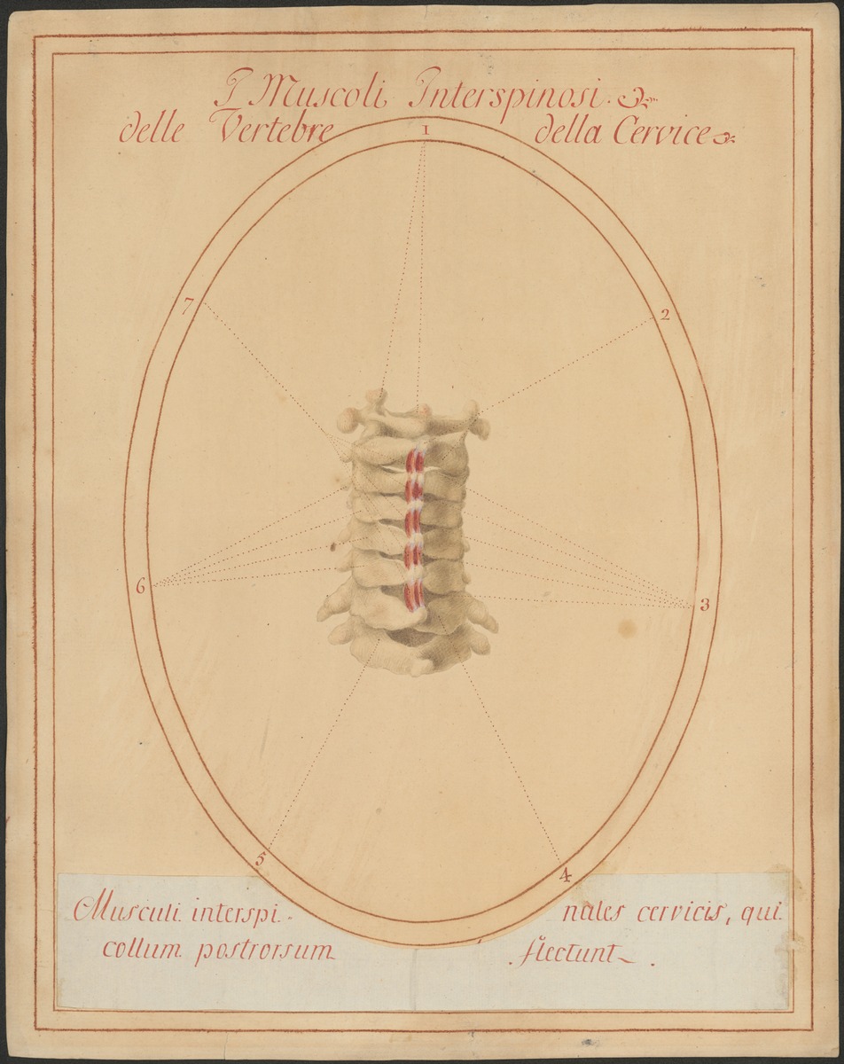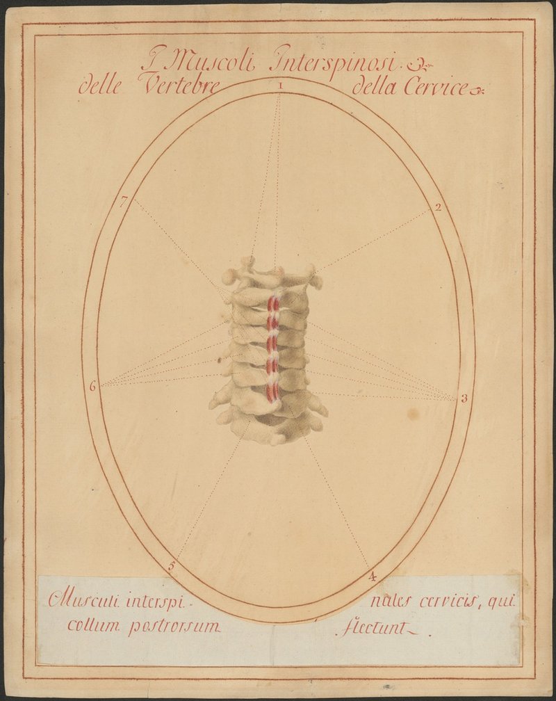 Isoliertes Modell der Halswirbel 2-7 und des ersten Brustwirbels von dorsal. Musculi Interspinales cervicis.