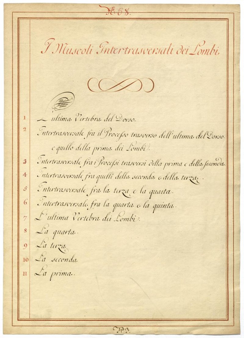 Der Text ist die ergänzende Beschreibung in italienischer Sprache zum anatomischen Wachsmodell der autochthonen Rückenmuskeln.
