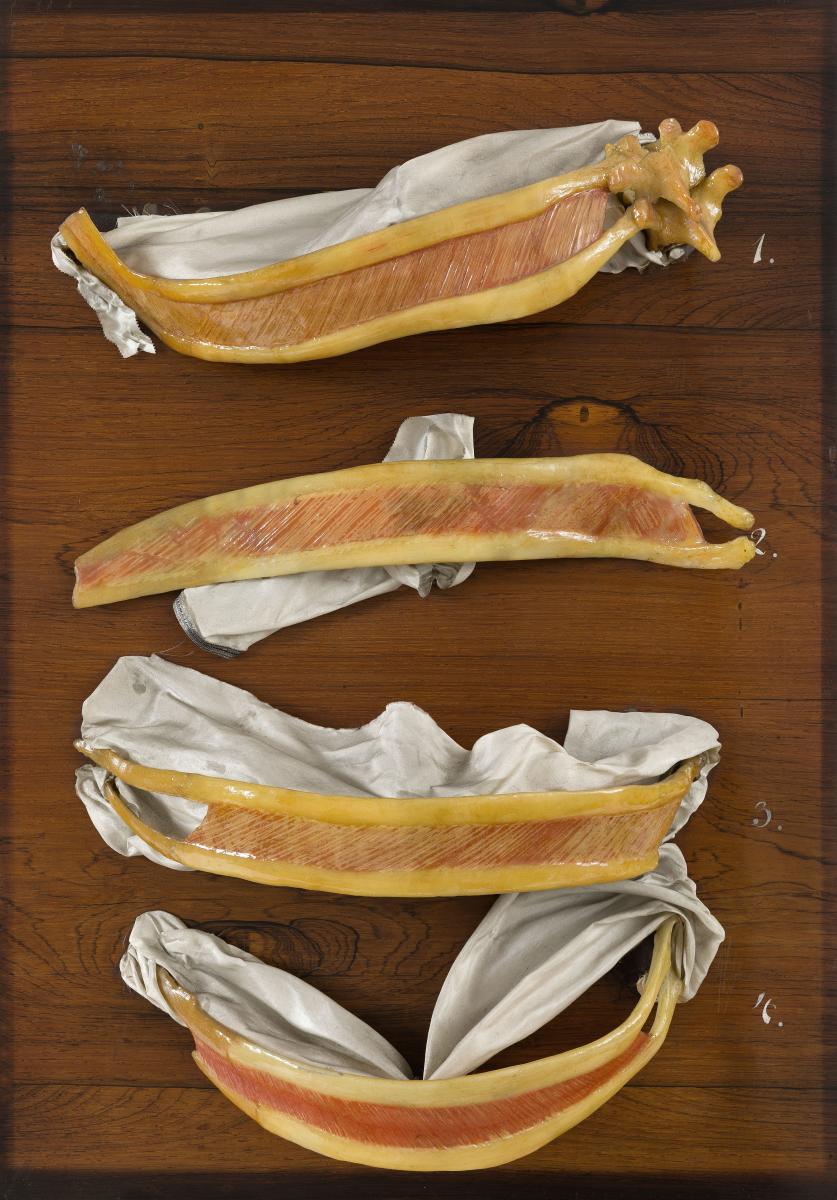 1. Ein äußerer Zwischenrippenmuskel (M. intercostalis externus) und ein Teil eines inneren Zwischenrippenmuskels (M. intercostalis internus). 2. Ein innerer Zwischenrippenmuskel (M. intercostalis internus) und ein Teil eines äußeren Zwischenrippenmuskels (M. intercostalis externus). 3. Ein äußerer Zwischenrippenmuskel (M. intercostalis externus). 4. Ein innerer Zwischenrippenmuskel (M. intercostalis internus), von außen.