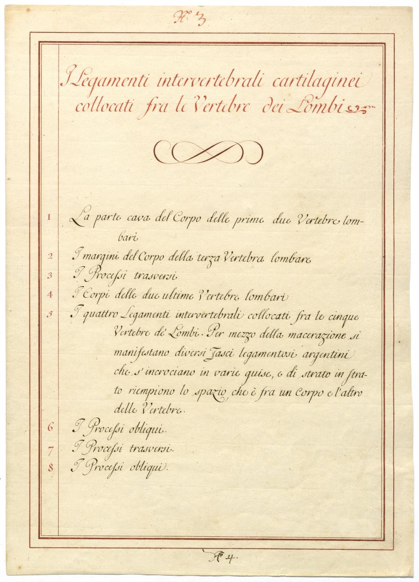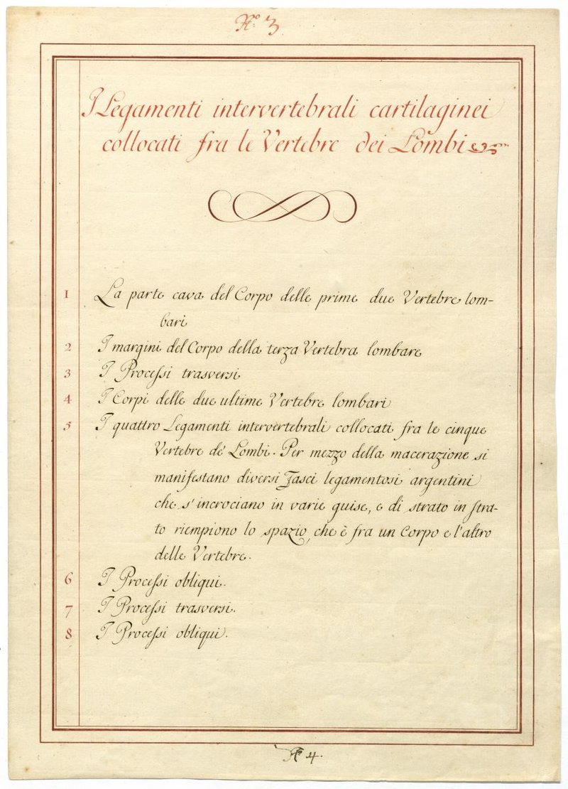 Der Text ist die ergänzende Beschreibung in italienischer Sprache zum anatomischen Wachsmodell der Knochen und Bänder im Lendenwirbel- und Brustwirbel-Bereich.