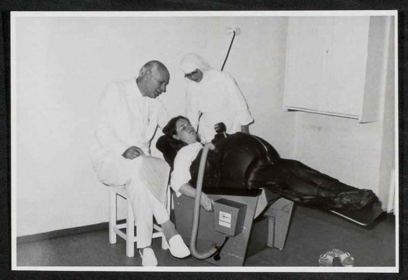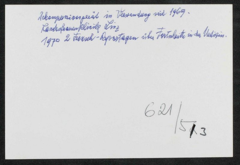 Es handelte sich um eine sogenannte Dekompressionsbehandlung nach Decomair. In der Landesfrauenklinik wurde das Gerät seit 1969 eingesetzt. Laut rückseitiger Anmerkung wurden 1970 zwei Fernsehreportagen über die Behandlungsmethode gedreht.