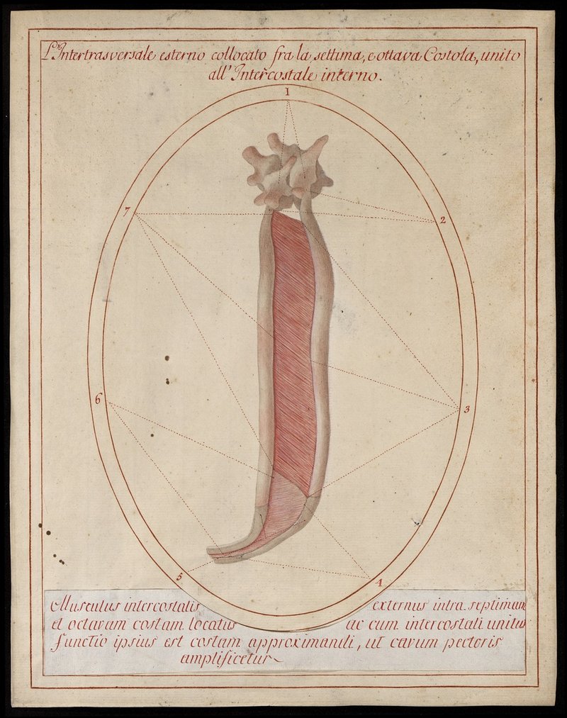 Ein äußerer Zwischenrippenmuskel (M. intercostalis externus) und ein Teil eines inneren Zwischenrippenmuskels (M. intercostalis internus).