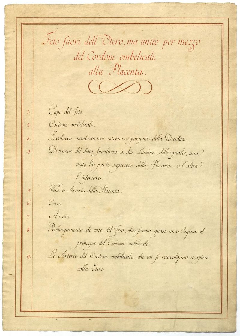 Der Text ist die ergänzende Beschreibung in italienischer Sprache zum anatomischen Wachsmodell einer Gebärmutter.