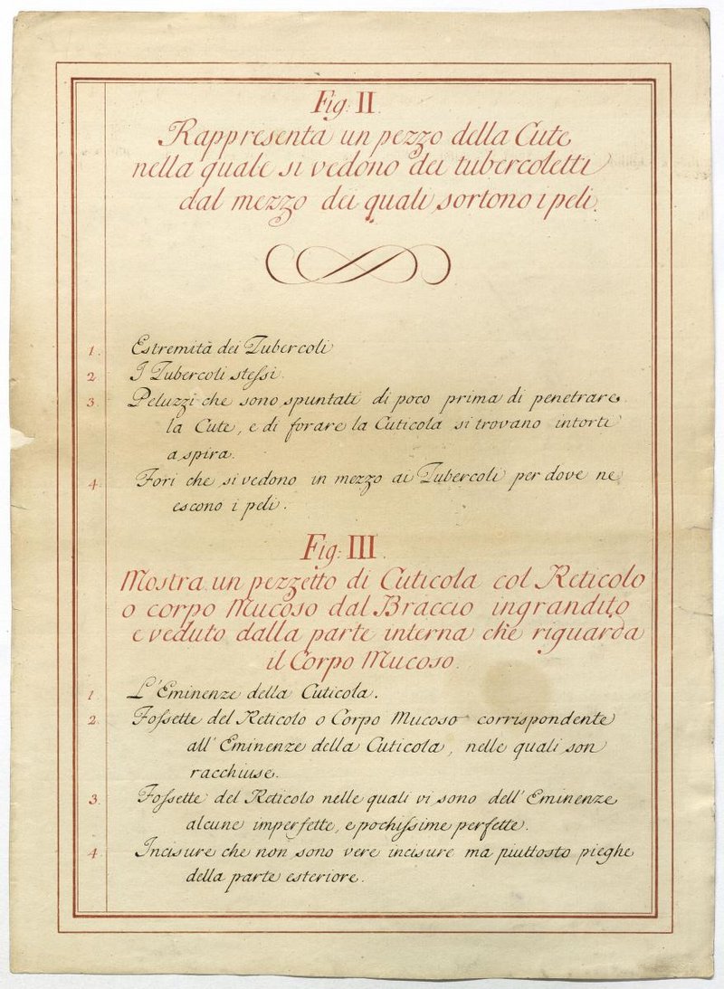Der Text ist die ergänzende Beschreibung in italienischer Sprache zum anatomischen Wachsmodell der Haut und Anhangsgebilde.