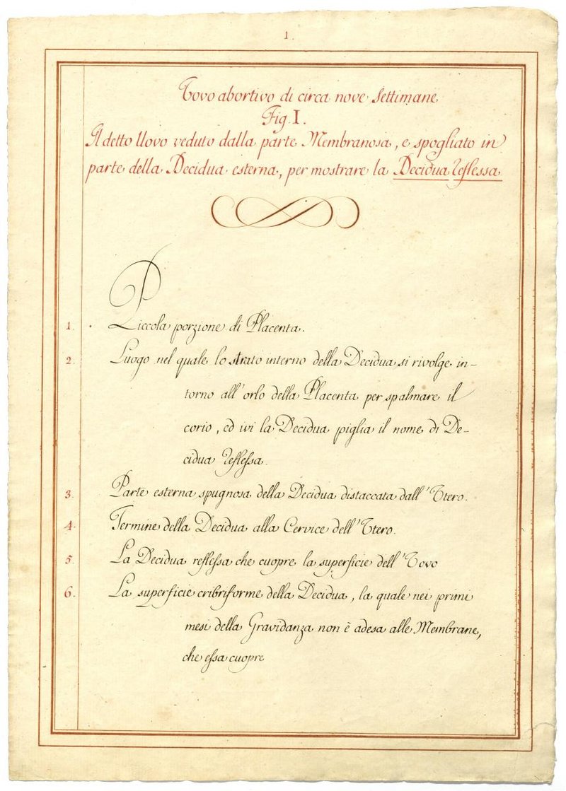 Der Text ist die ergänzende Beschreibung in italienischer Sprache zum anatomischen Wachsmodell der Gebärmutter.