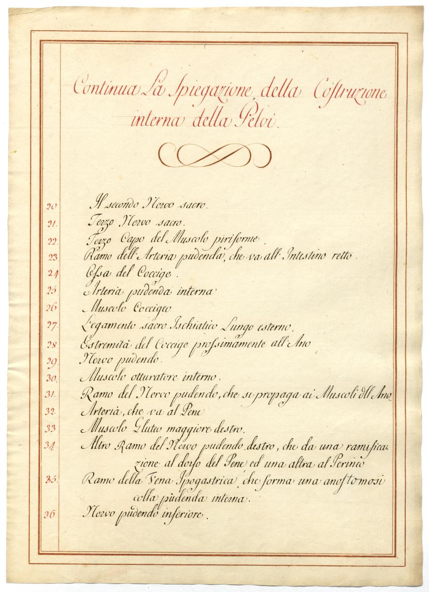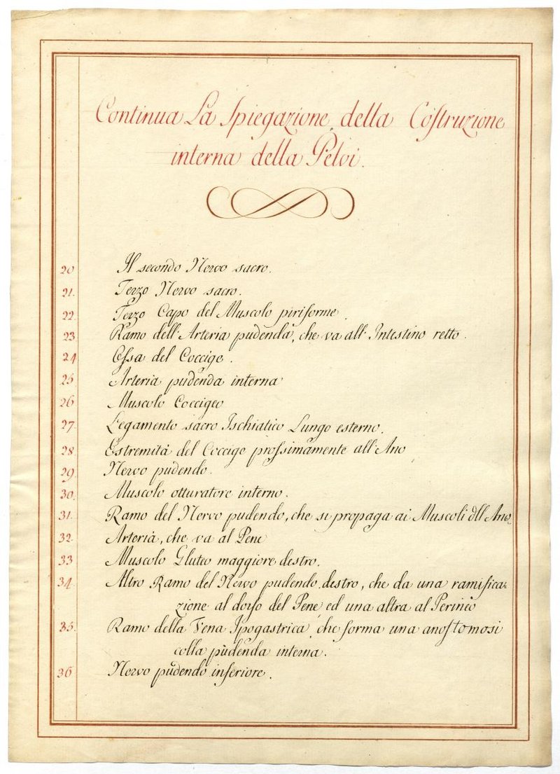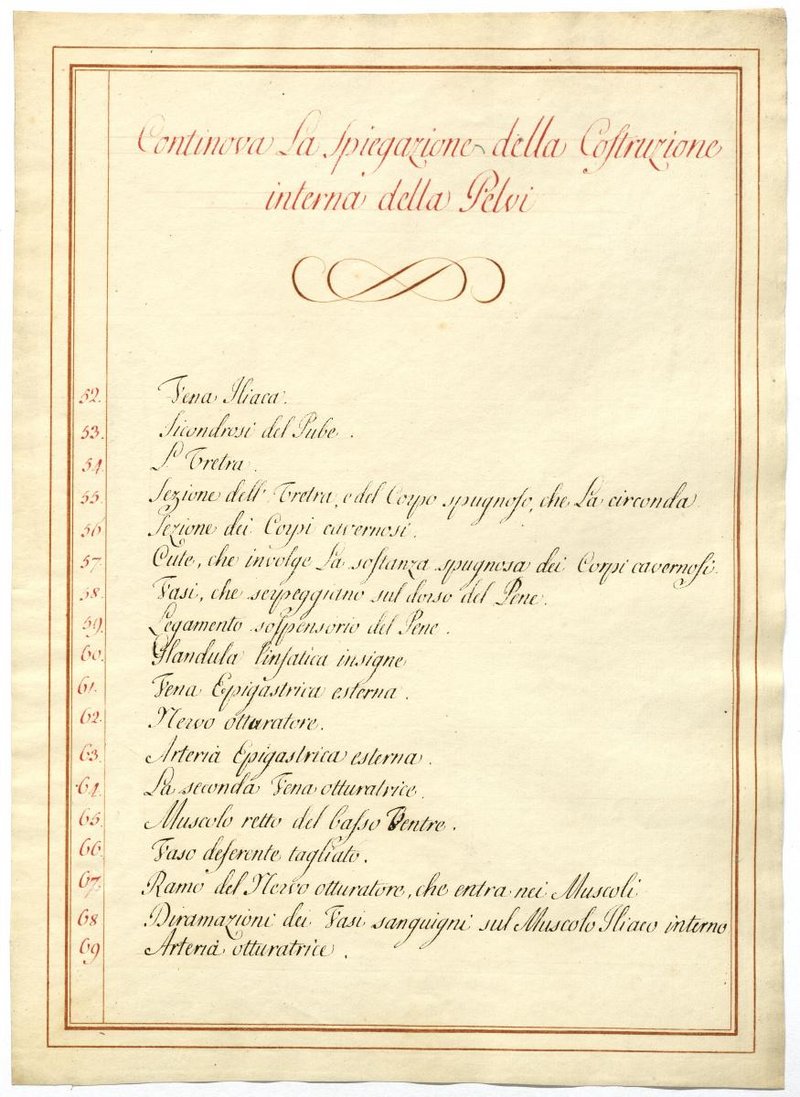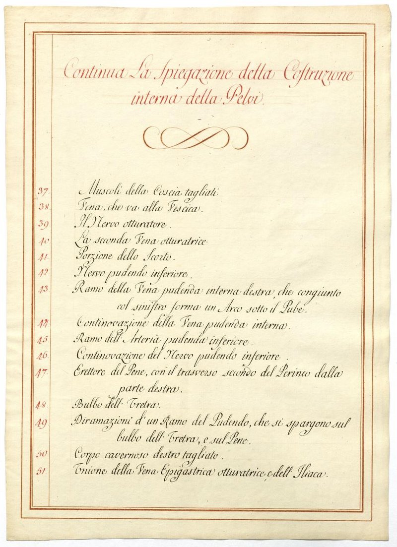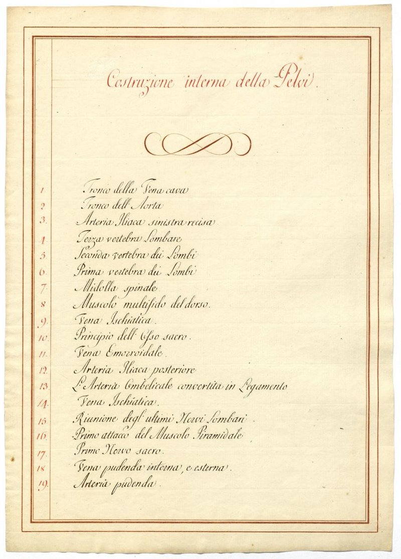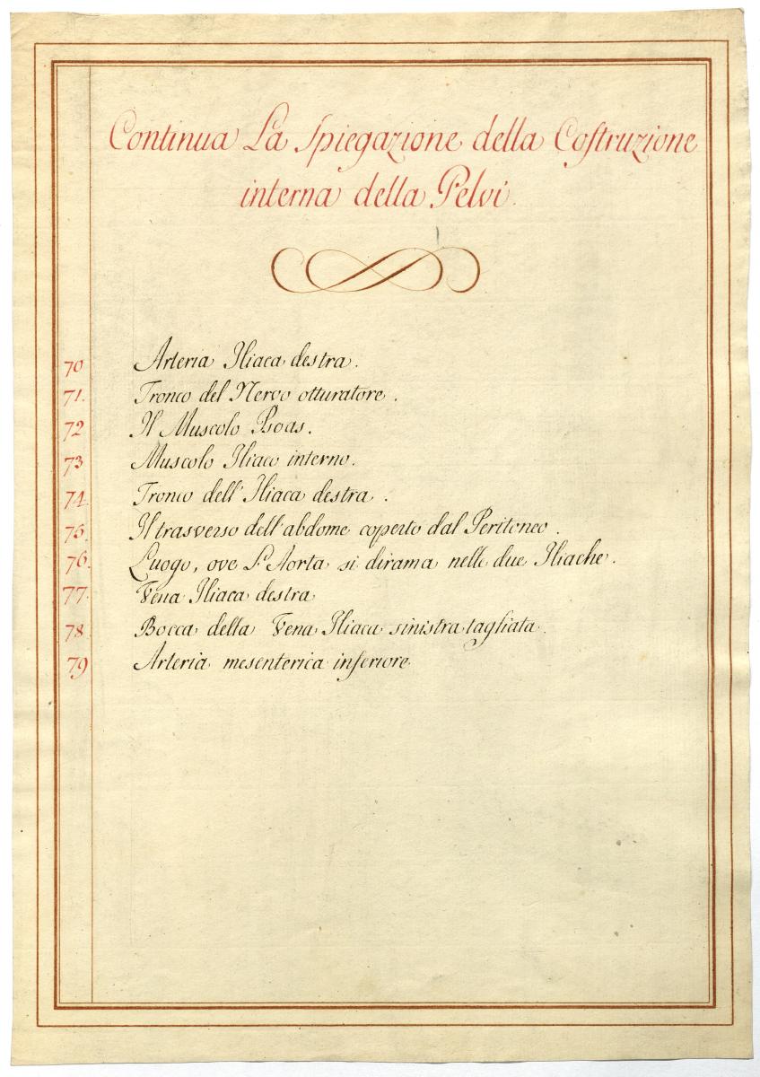 Der Text ist die ergänzende Beschreibung in italienischer Sprache zum anatomischen Wachsmodell der Beckengefäße.