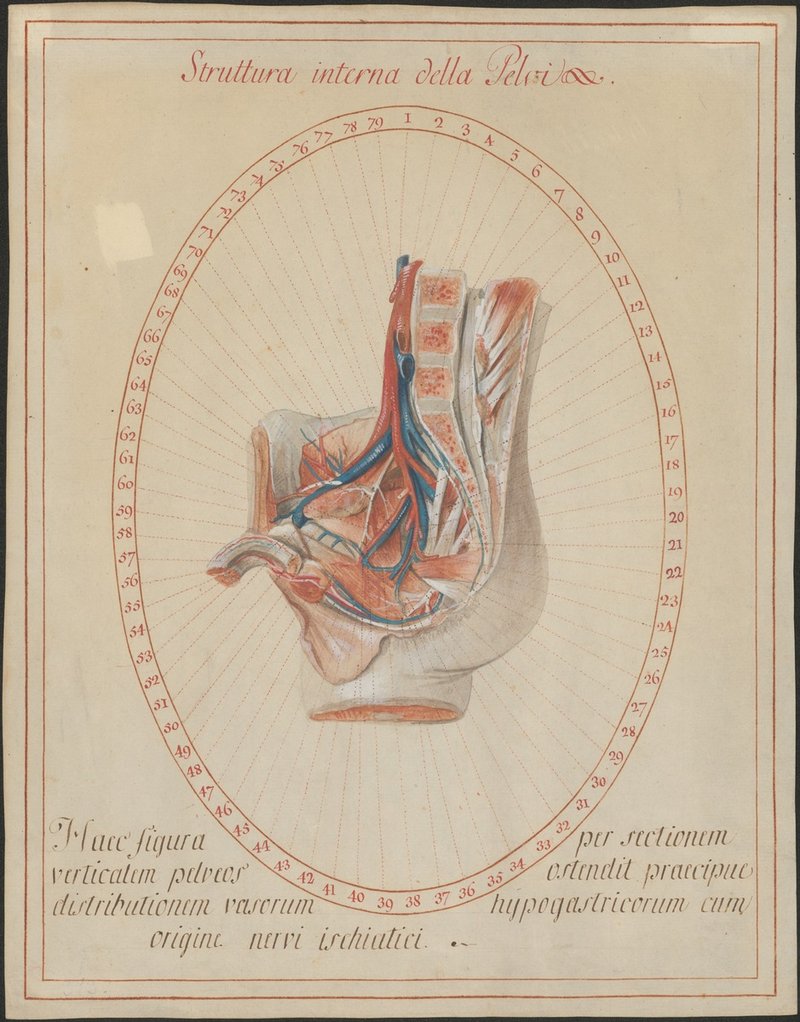 Ein neben der Mittelebene geführter Schnitt durch ein männliches Becken mit den Muskeln, Gefäßen und Nerven an seiner Innenwand. Die Eingeweide wurden entfernt.