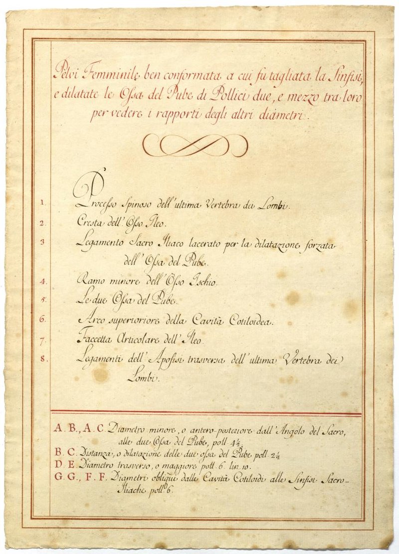 Der Text ist die ergänzende Beschreibung in italienischer Sprache zum anatomischen Wachsmodell eines weiblichen Beckens.