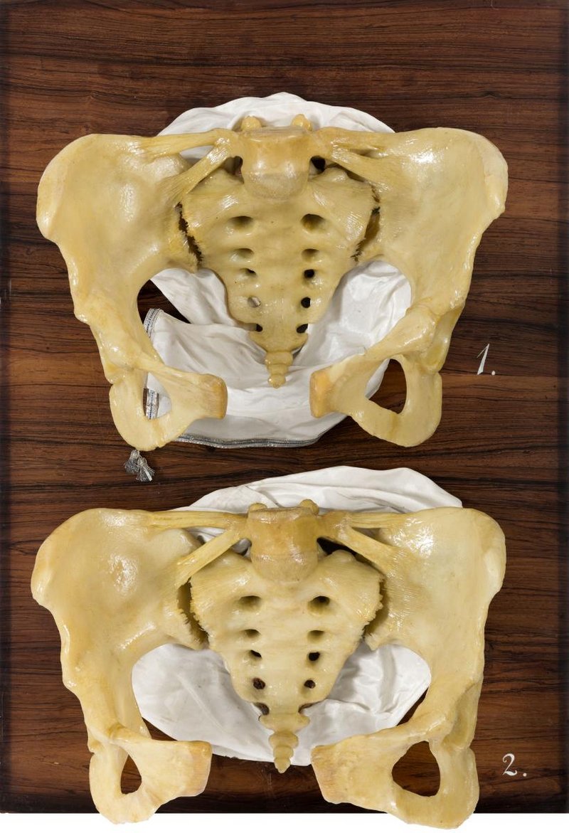 1. und 2. Ein normales weibliches Becken, das durch Schamfugentrennung (Symphyseotomie) und Durchtrennung der vorderen Kreuzbein-Darmbeinbänder (Ligg. sacroiliaca ventralia) erweitert wurde.