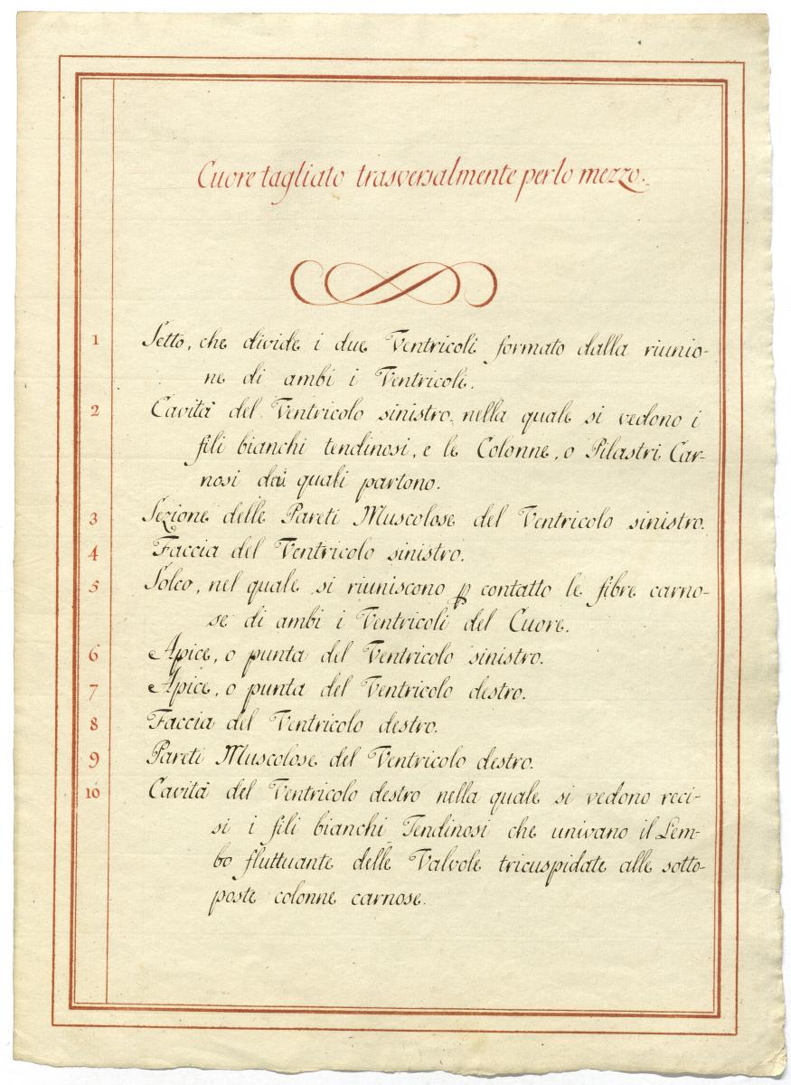 Der Text ist die ergänzende Beschreibung in italienischer Sprache zum anatomischen Wachsmodell des Herzens.