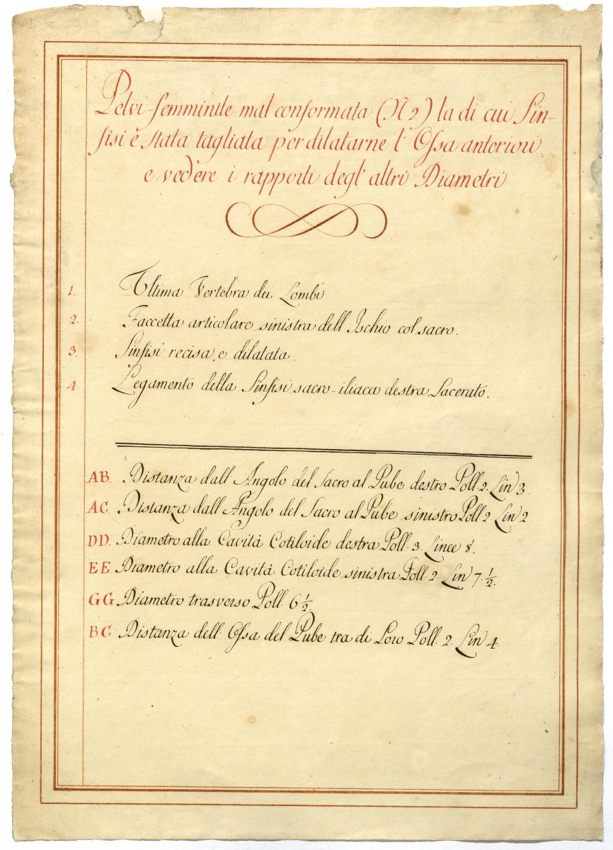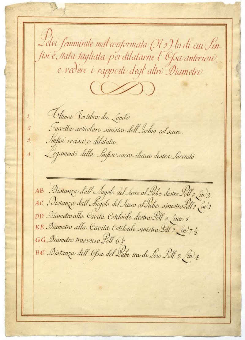 Der Text ist die ergänzende Beschreibung in italienischer Sprache zum anatomischen Wachsmodell eines weiblichen Beckens.