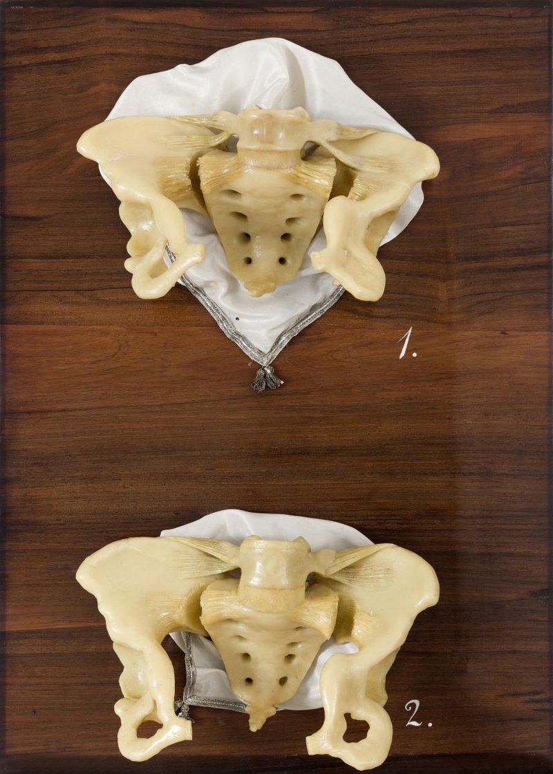 1. und 2. Ein schräg verengtes Becken, das durch Schamfugentrennung (Symphyseotomie) und Durchtrennung der Kreuzbein-Darmbeinbänder (Ligg. sacroiliaca ventralia) erweitert wurde.