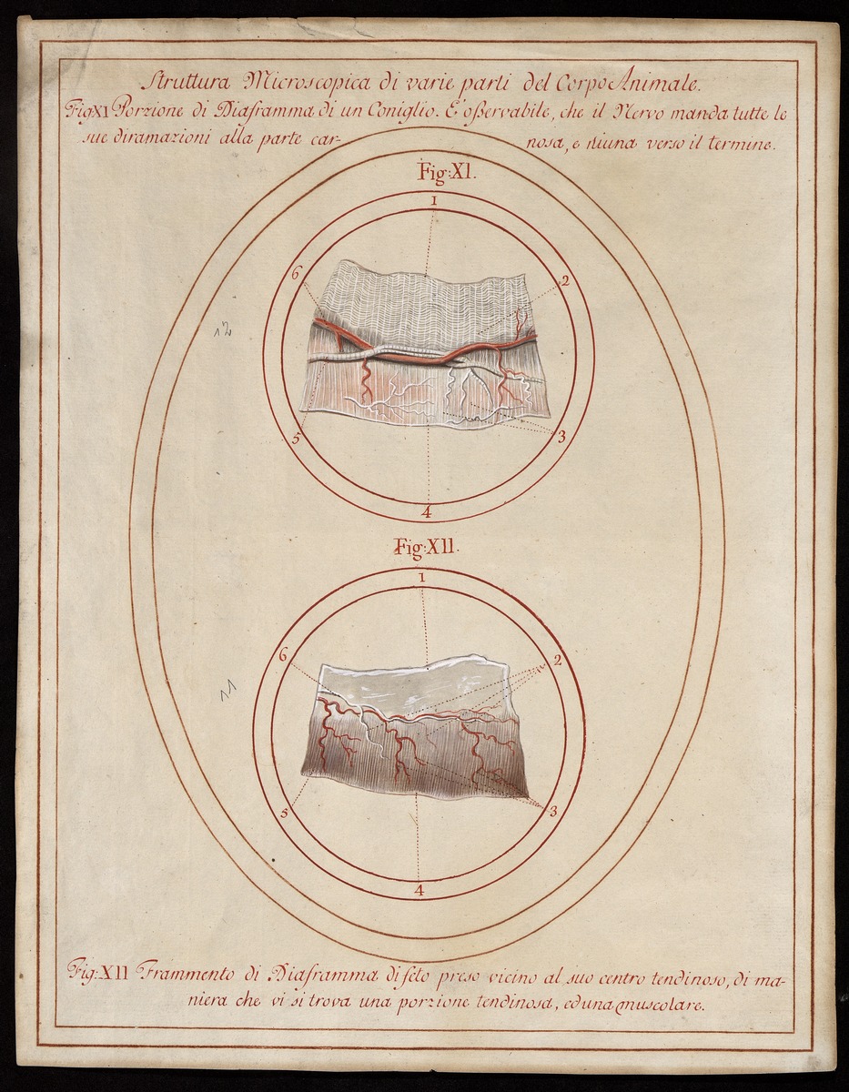 Fig. 11: 313/12: Ein Stück vom sehnigen Teil des Zwerchfells eines Kaninchens mit Darstellung von Nerven und Arterien. Fig. 12: 313/11: Ein Stück vom Zwerchfell eines menschlichen Fötus mit injizierten Arterien.