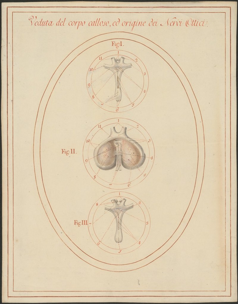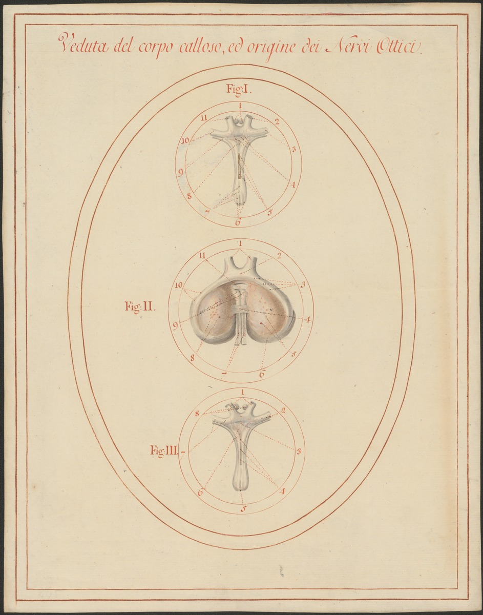 Fig. 1: 257/4: Ein Teil des Balkens (Rostrum corporis callosi), die Sehnervenkreuzung (Chiasma opticum) und der Anfang der Sehstränge (Tractus optici). Fig. 2: 257/2: Der Eintritt der Sehstränge (Tractus optici) in den Thalamus. Fig. 3: 257/3: Sehnervenkreuzung (Chiasma opticum) und der Anfang der Sehstränge (Tractus optici).