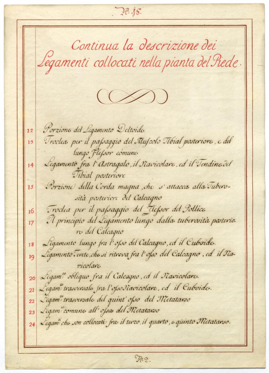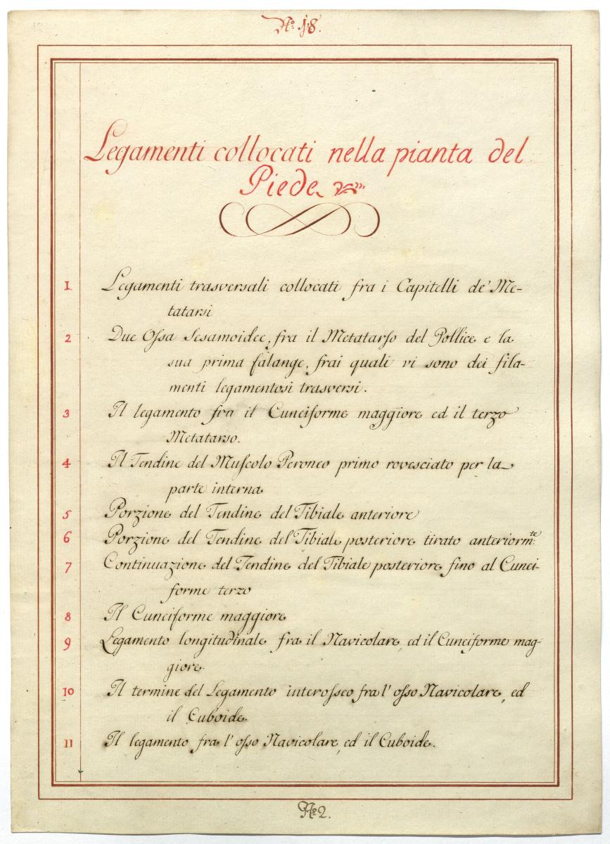 Der Text ist die ergänzende Beschreibung in italienischer Sprache zum anatomischen Wachsmodell des Fußes.