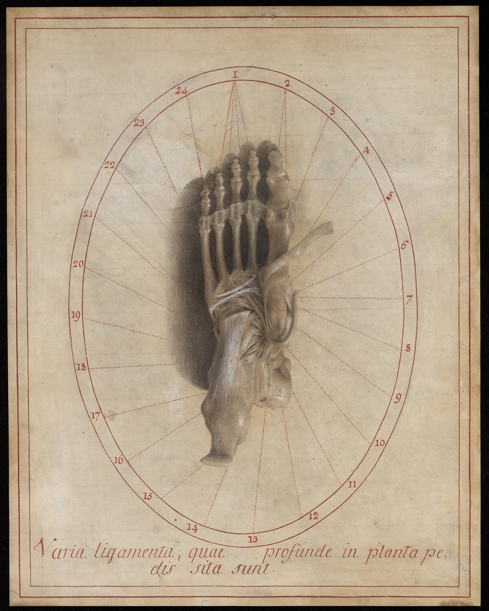 Ansicht der rechten Fußsohle. Haut, Unterhautfettgewebe sowie einige Muskel und Muskelsehnen sind entfernt. Ein Teil des tiefen Band- und Muskel- bzw. Sehnenapparates der Fußsohle ist dargestellt: die tiefen queren Mittelfußbänder (Ligamentum metatarsale transversum profundum), die Bandverbindungen zwischen den Keilbeinen und dem Kahnbein (Ligamenta cuneonavicularia plantaria), das lange Fußsohlenband (Ligamentum plantare longum), das Band zwischen Fersenbein und Kahnbein (Ligamentum calcaneonaviculare plantare) sowie die zurückgeschlagene Sehne des langen Wadenbeinmuskels (Musculus peroneus longus), die Sehne des vorderen Schienbeinmuskels (Musculus tibialis anterior), die zurückgeschlagene Sehne des hinteren Schienbeinmuskels (Musculus tibialis posterior), die Achillessehne (Tendocalcaneus [Achillis]).
