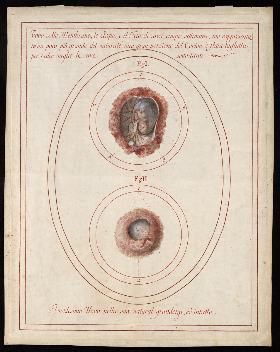 Ein ungefähr vier Wochen alter Embryo mit seinen Häuten.