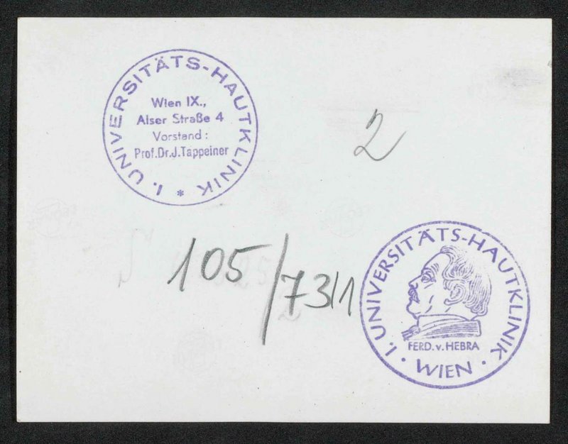 Rückseitig mit zwei Stempeln, die auf die Zeit von Josef Tappeiner als Klinikvorstand hinweisen. Neg I 56/41