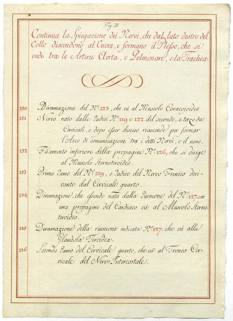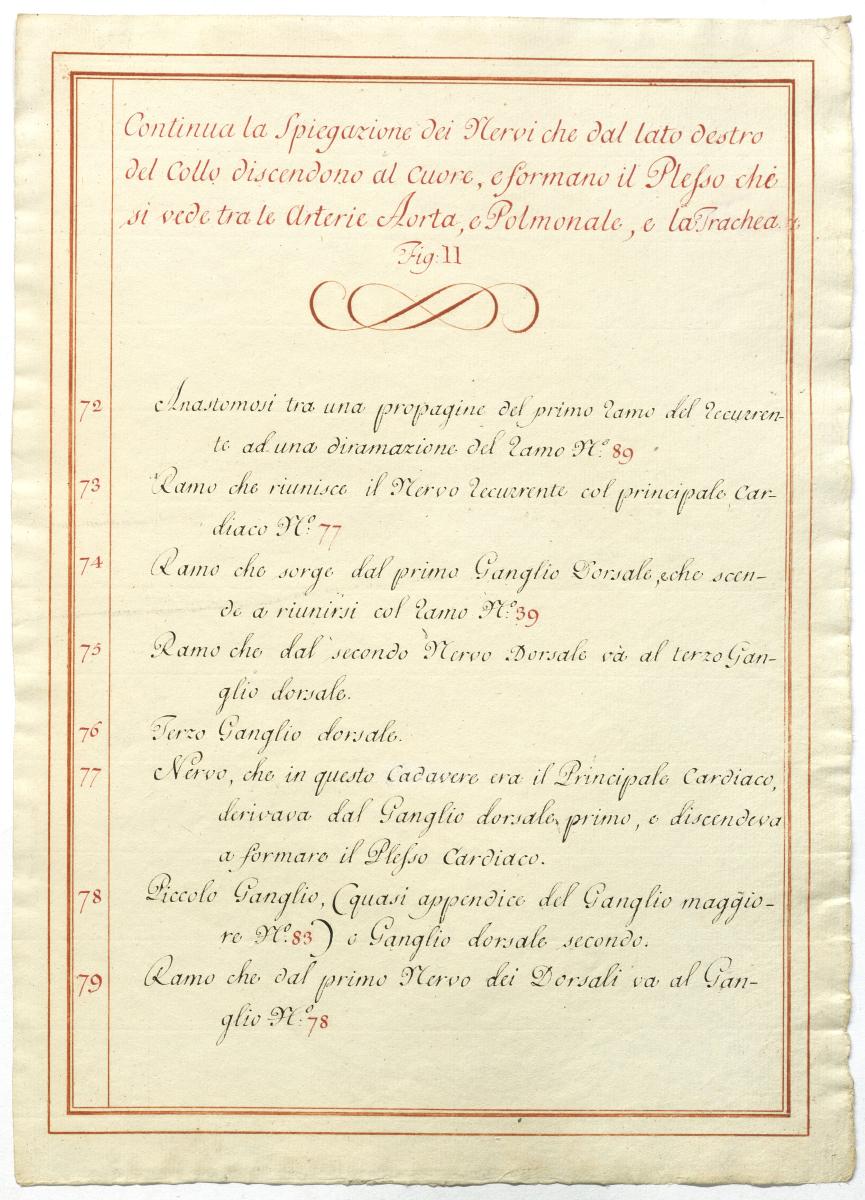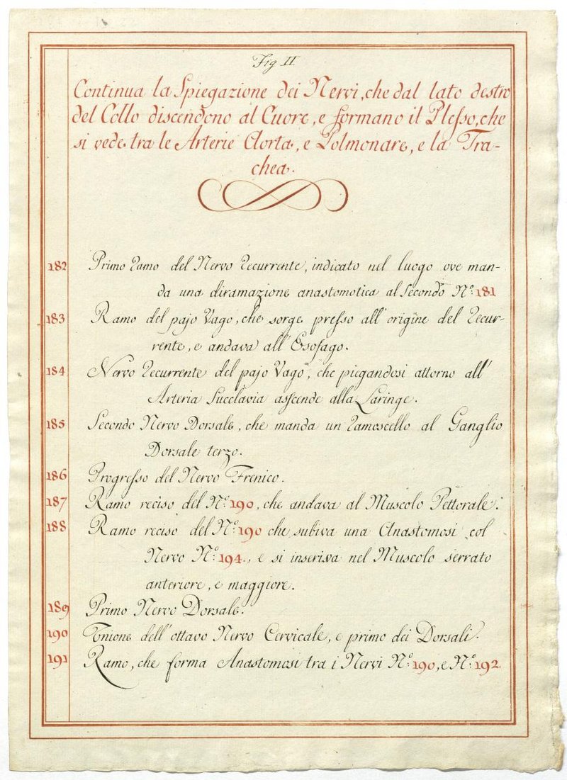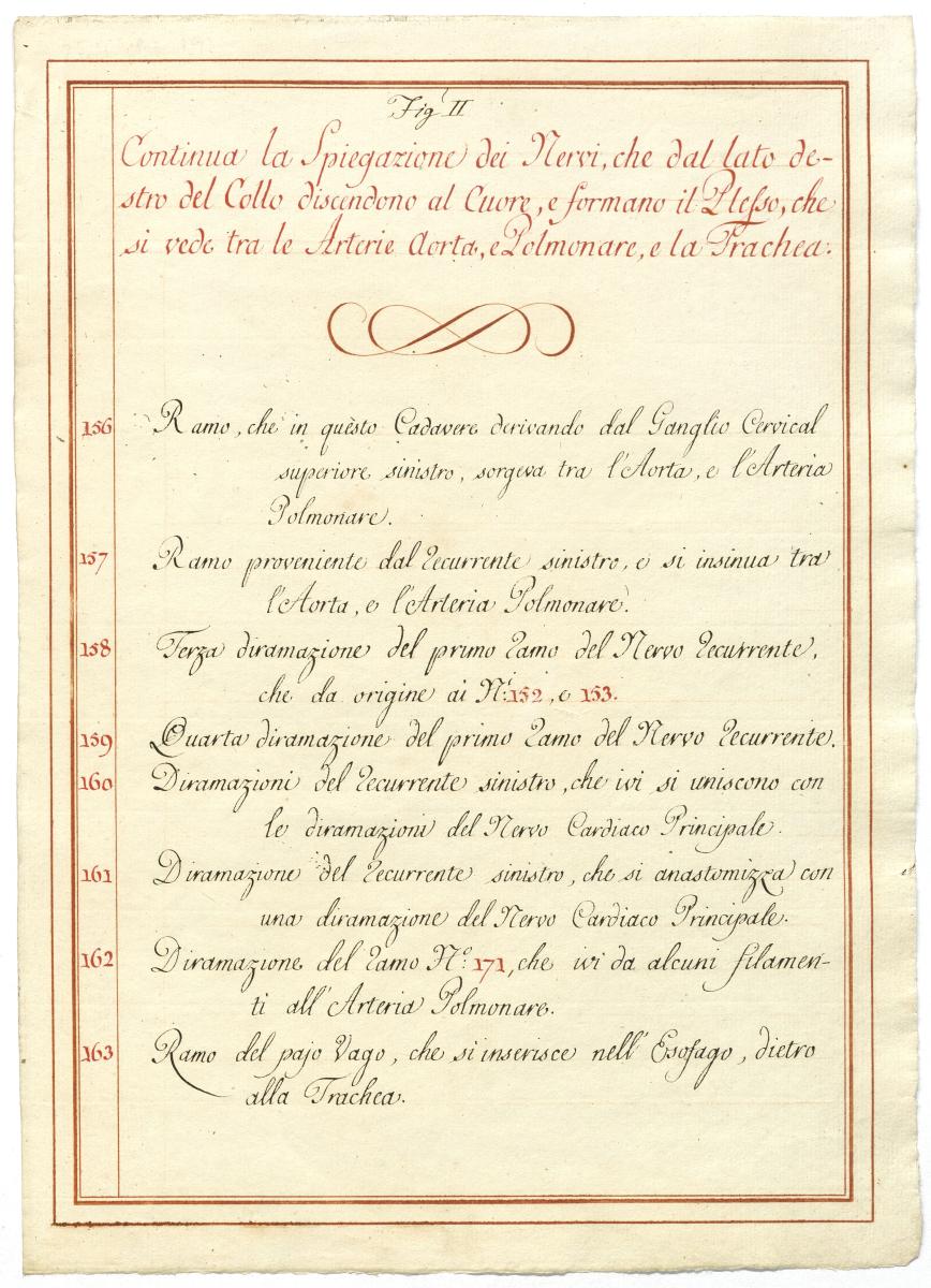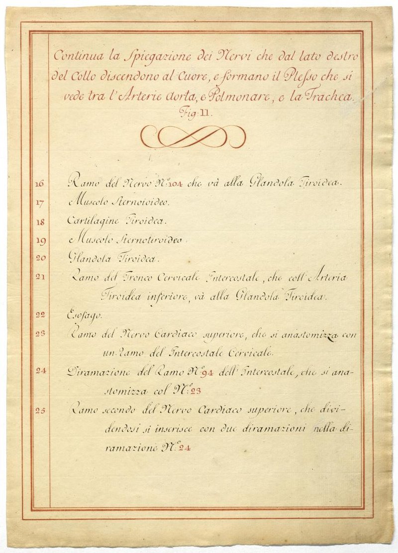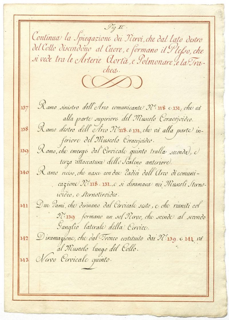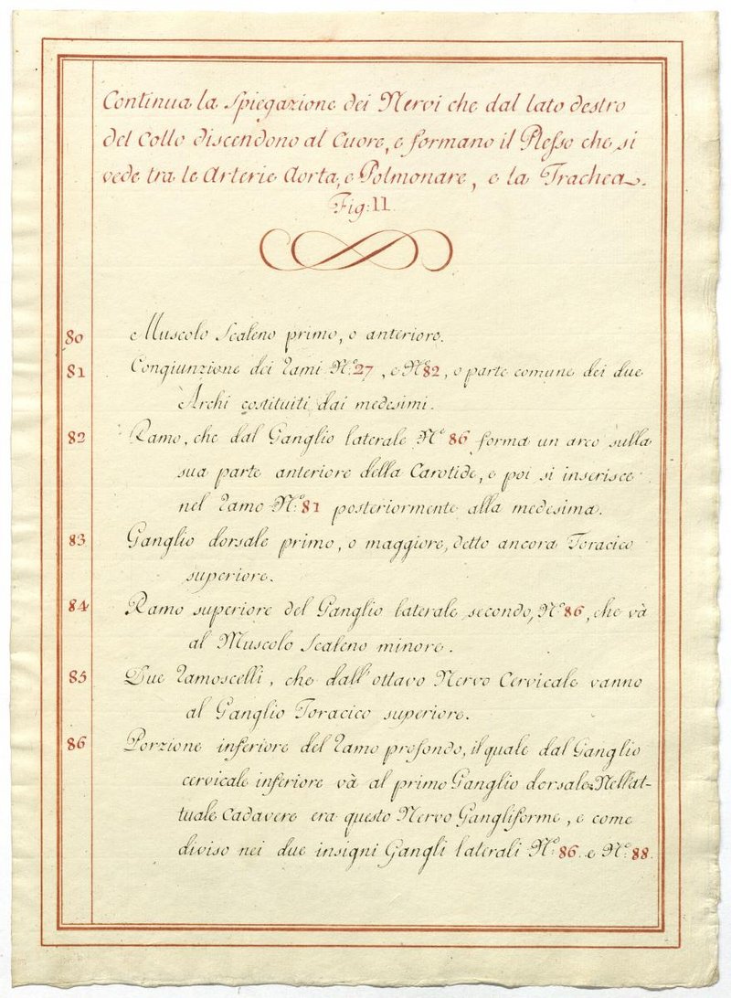 Der Text ist die ergänzende Beschreibung in italienischer Sprache zum anatomischen Wachsmodell des Plexus cervicalis, Nervus vagus und Nervus hypoglossus.
