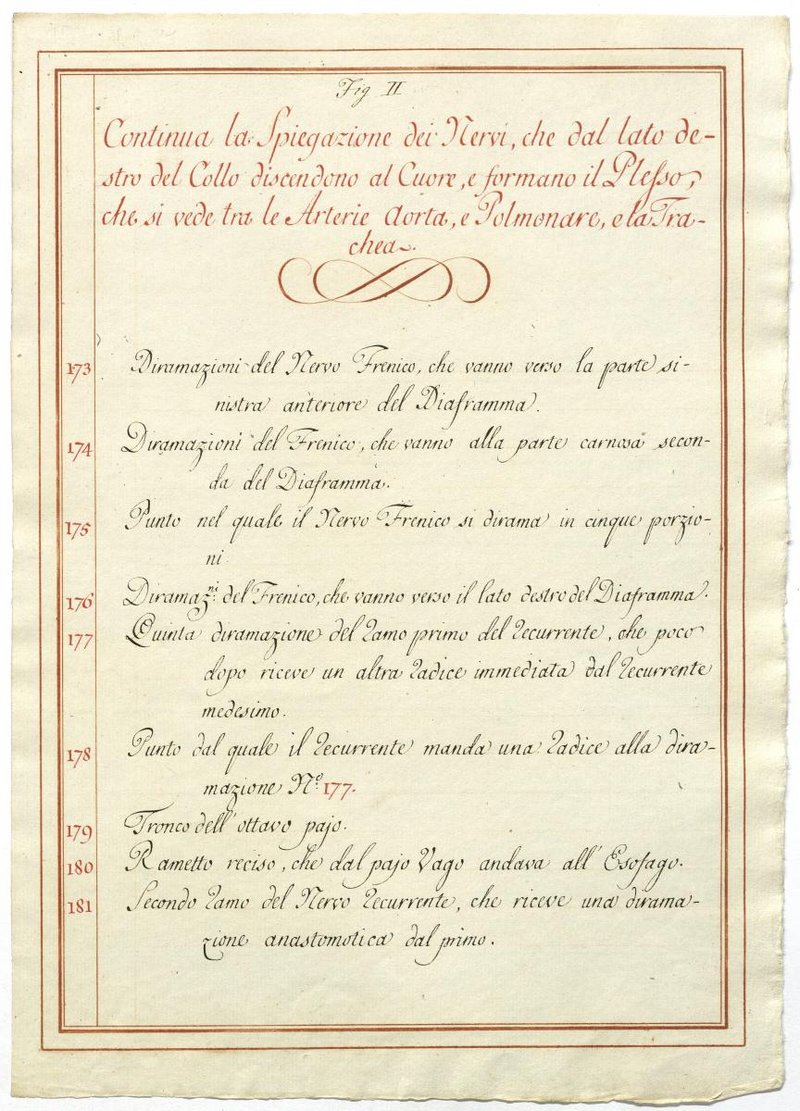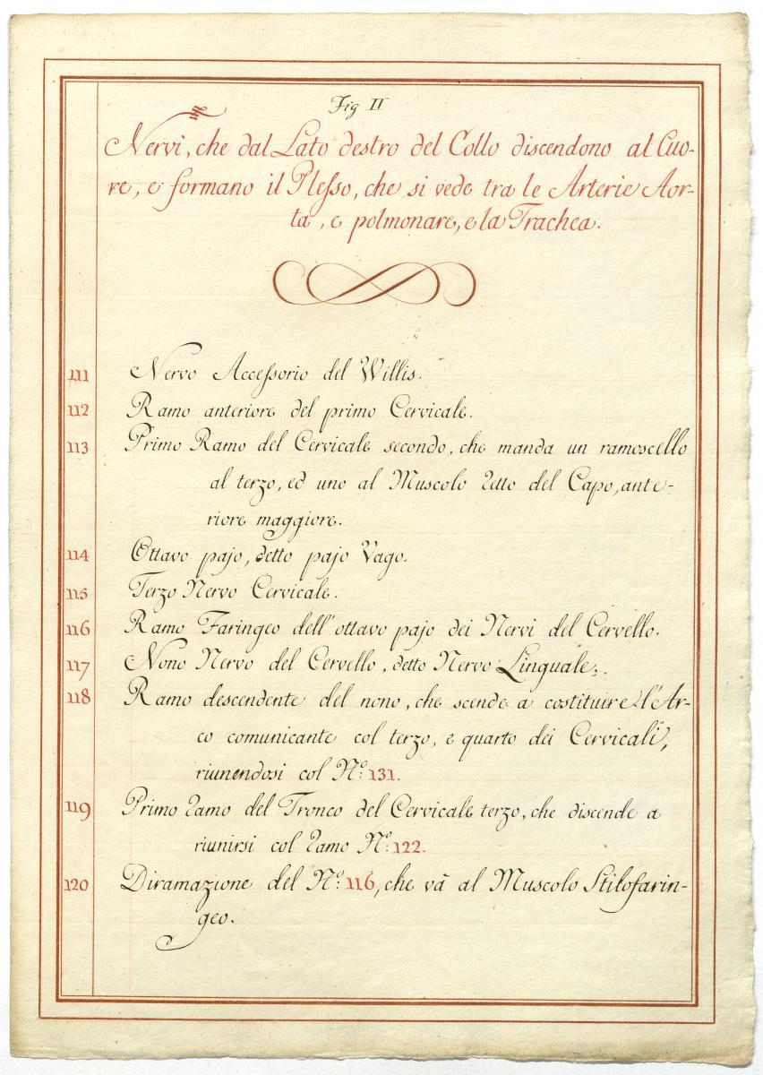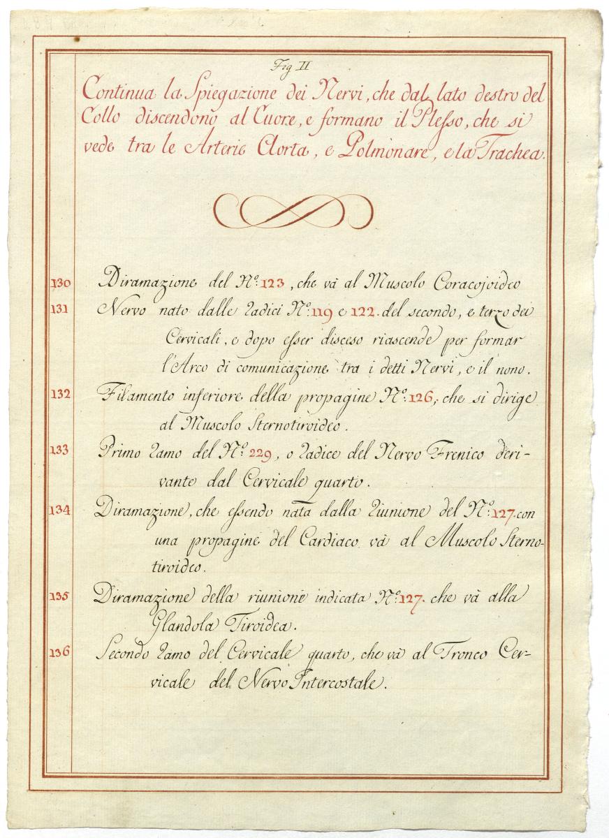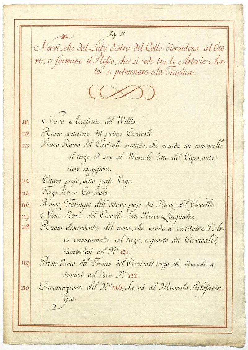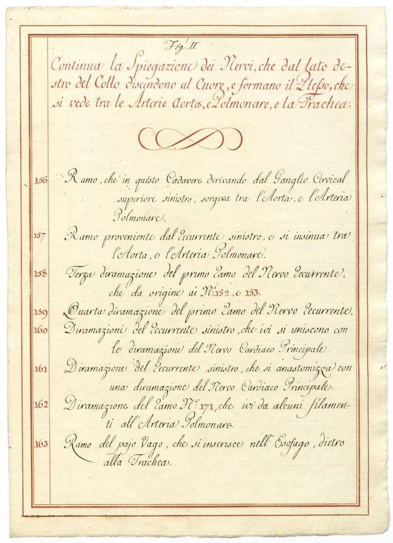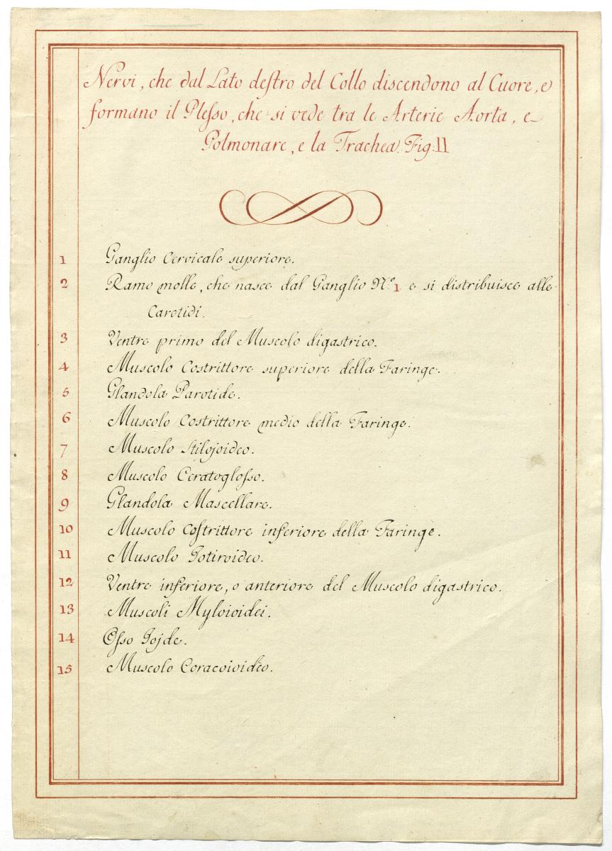 Der Text ist die ergänzende Beschreibung in italienischer Sprache zum anatomischen Wachsmodell des Plexus cervicalis, Nervus vagus und Nervus hypoglossus.