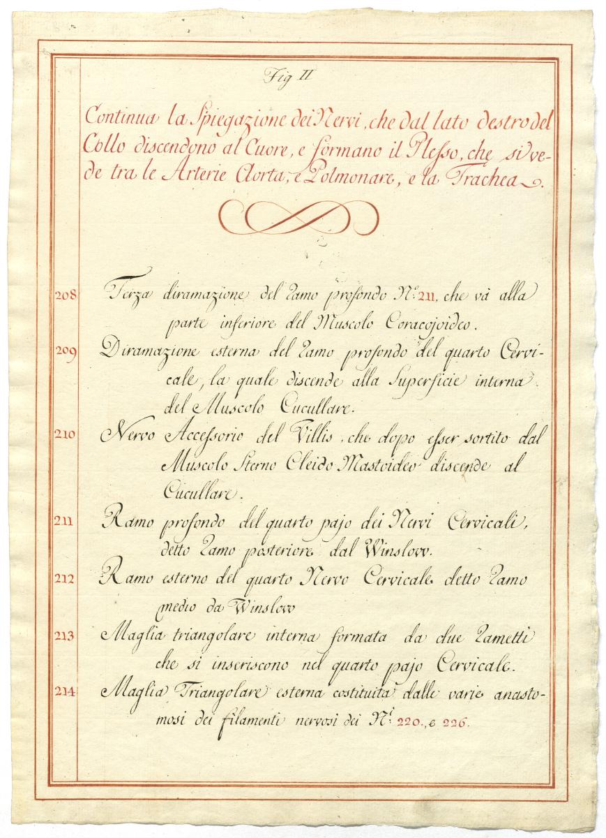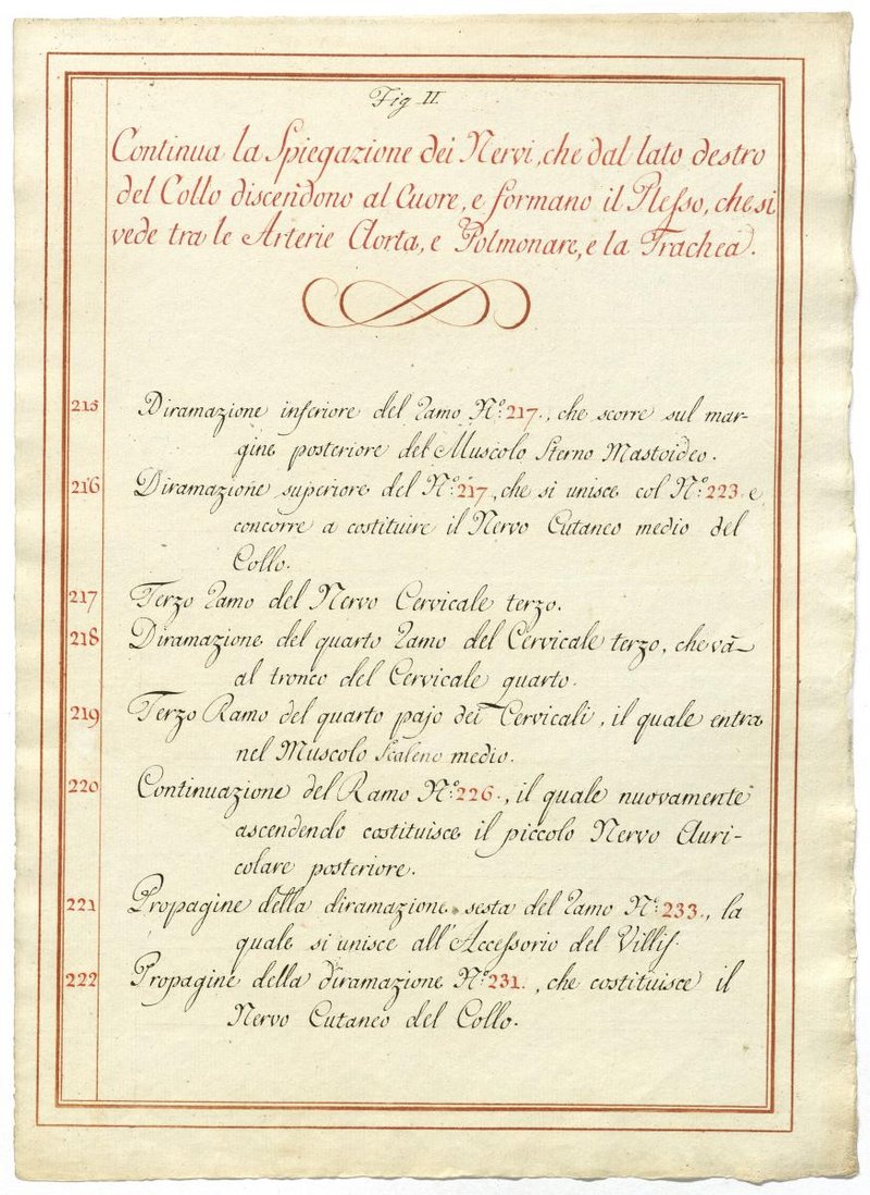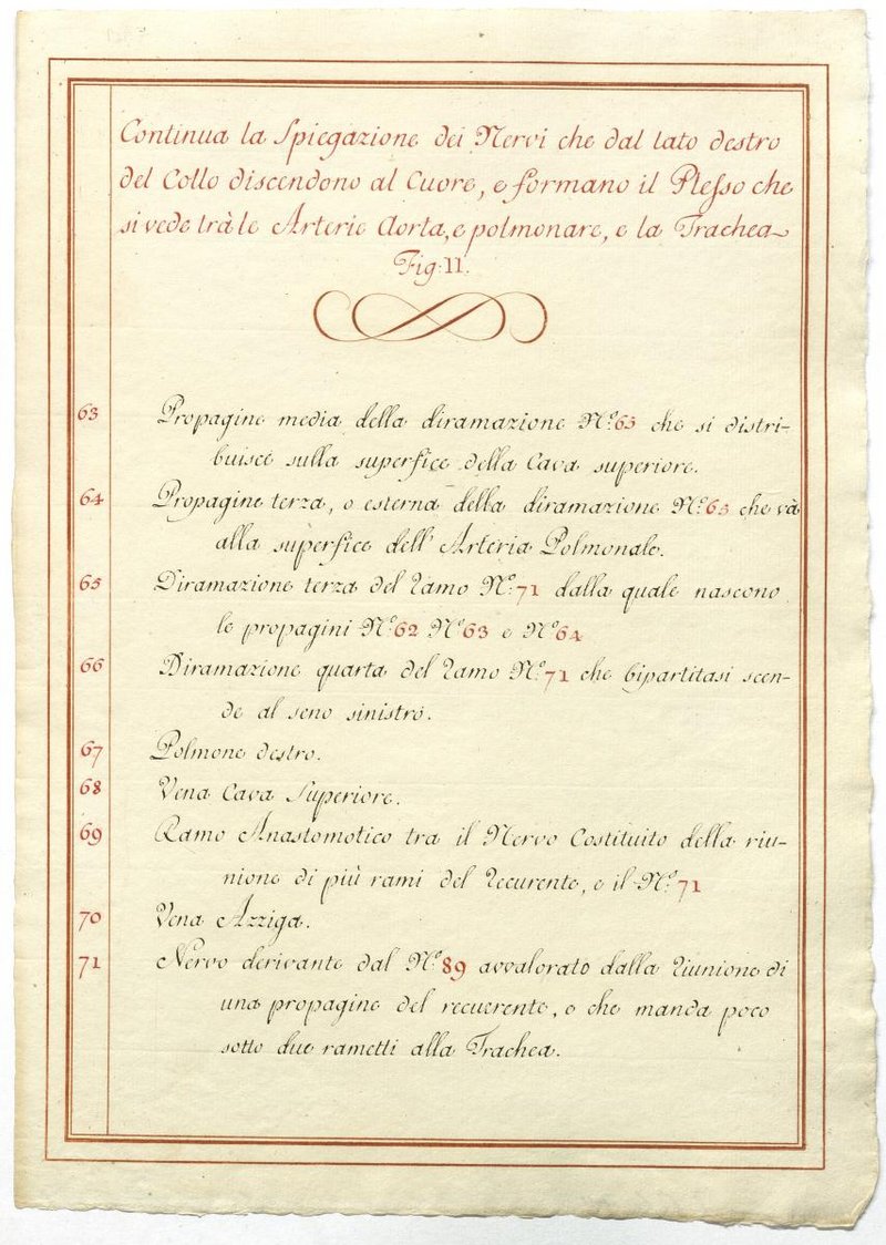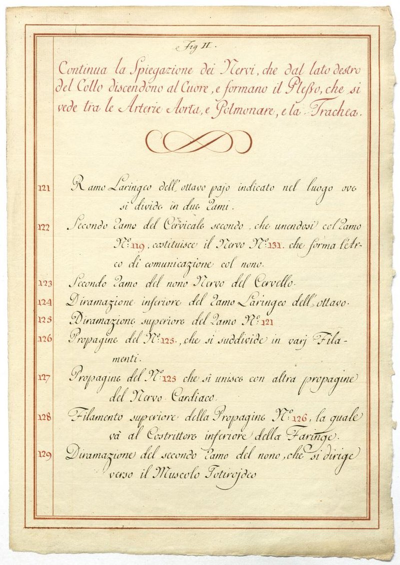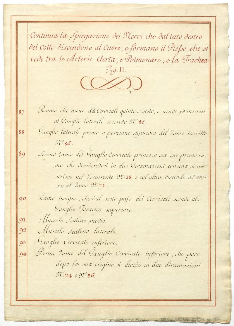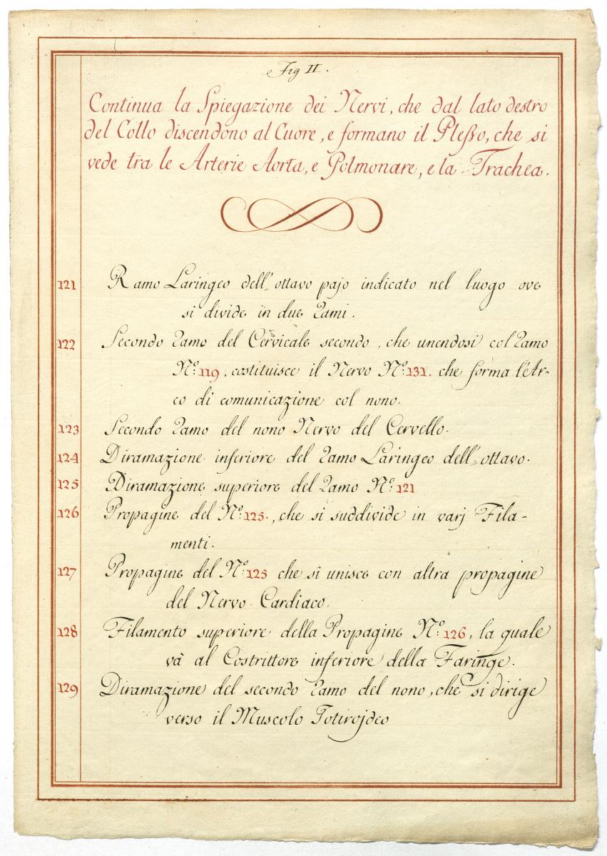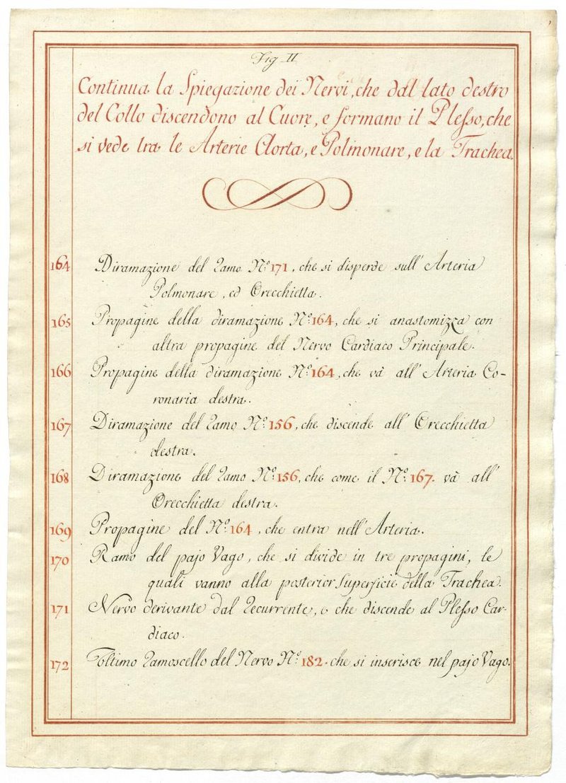 Der Text ist die ergänzende Beschreibung in italienischer Sprache zum anatomischen Wachsmodell des Plexus cervicalis, Nervus vagus und Nervus hypoglossus.