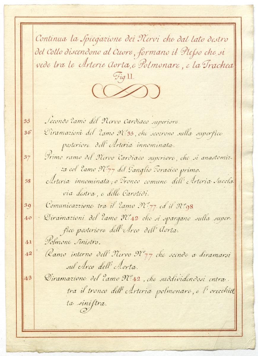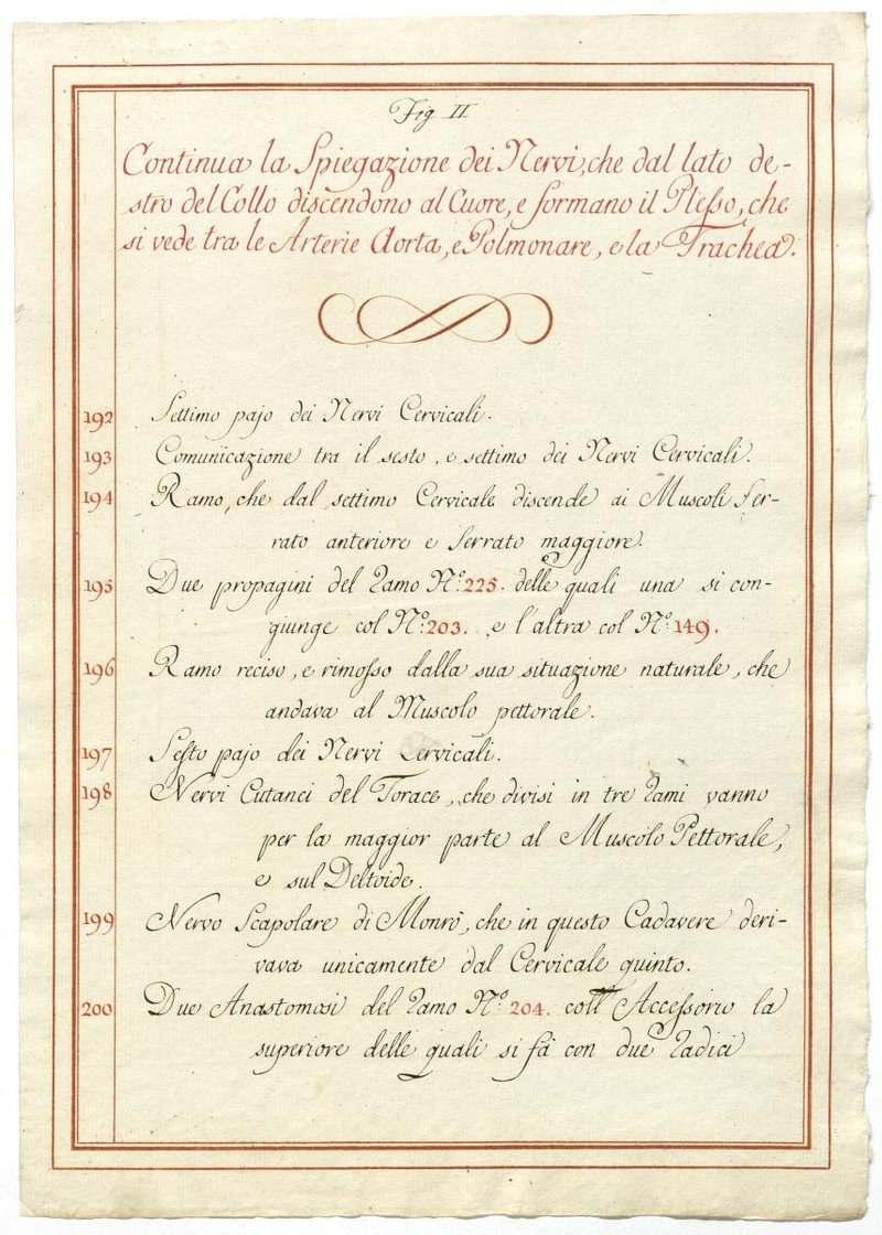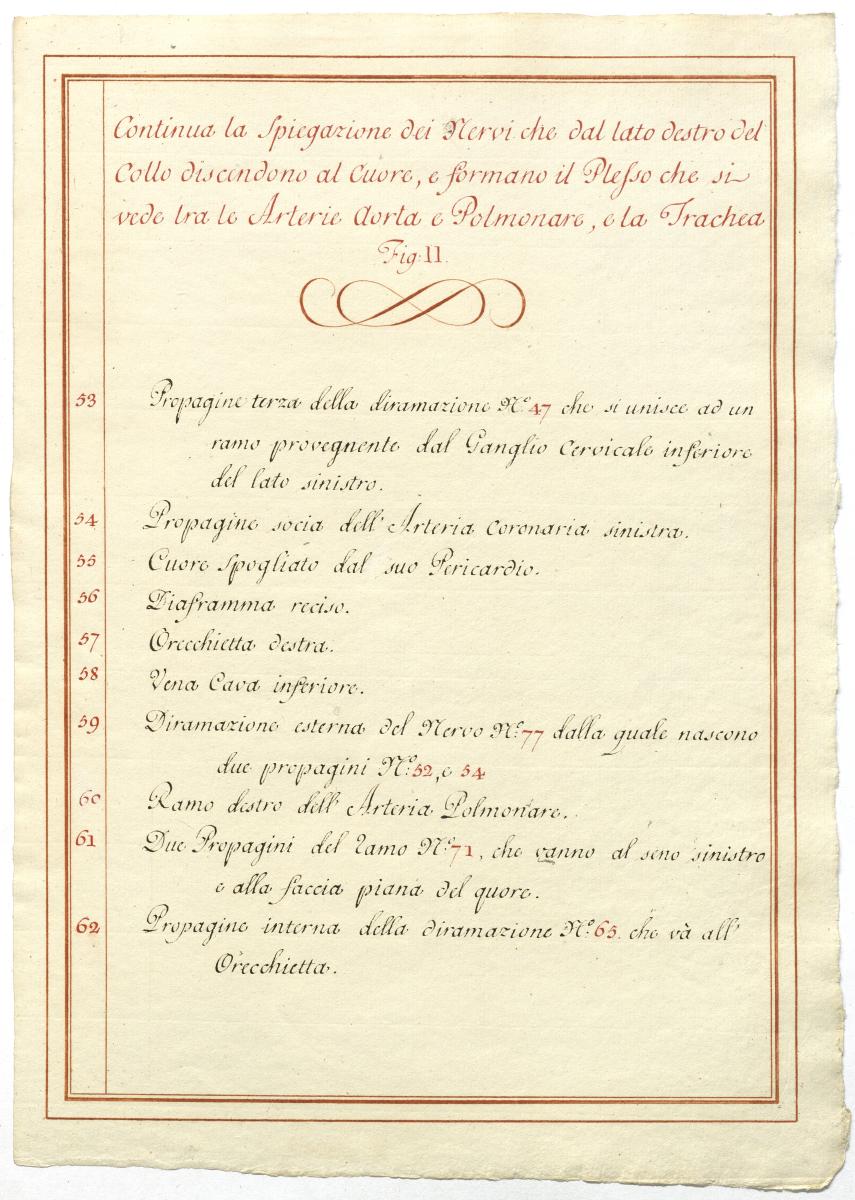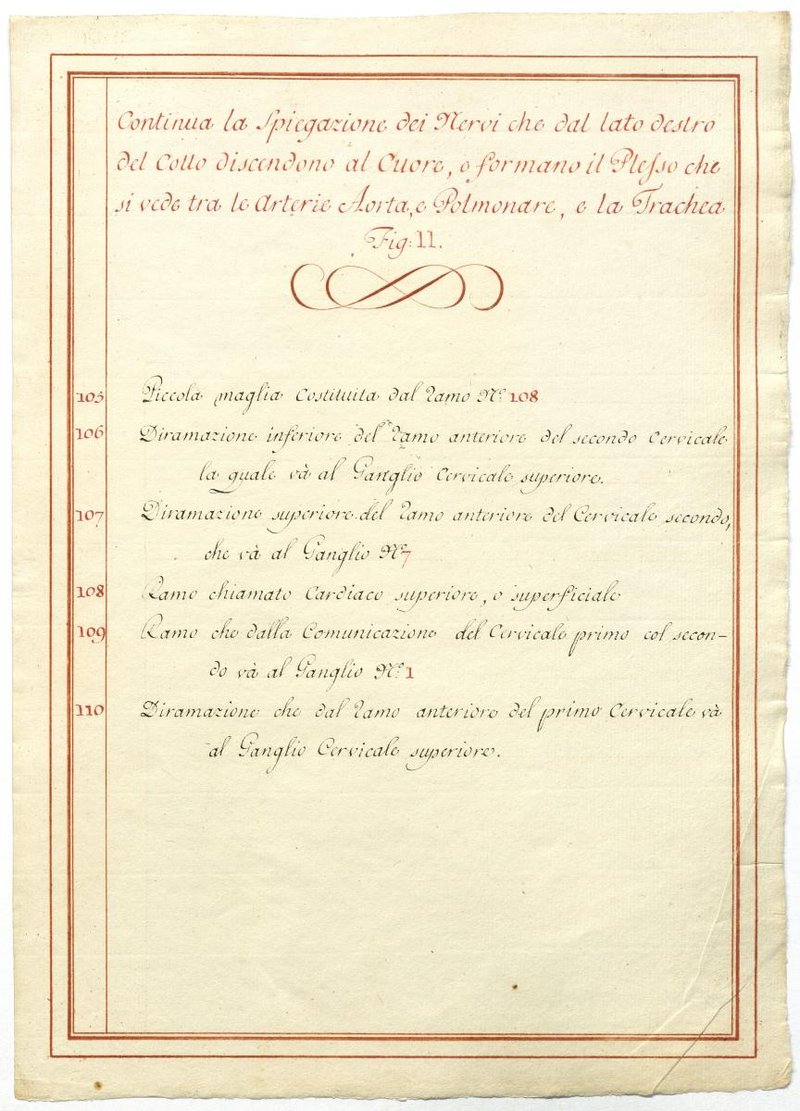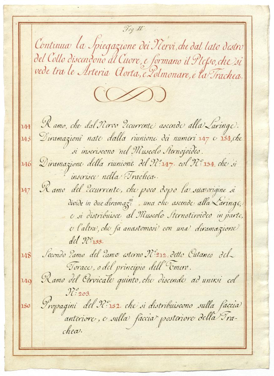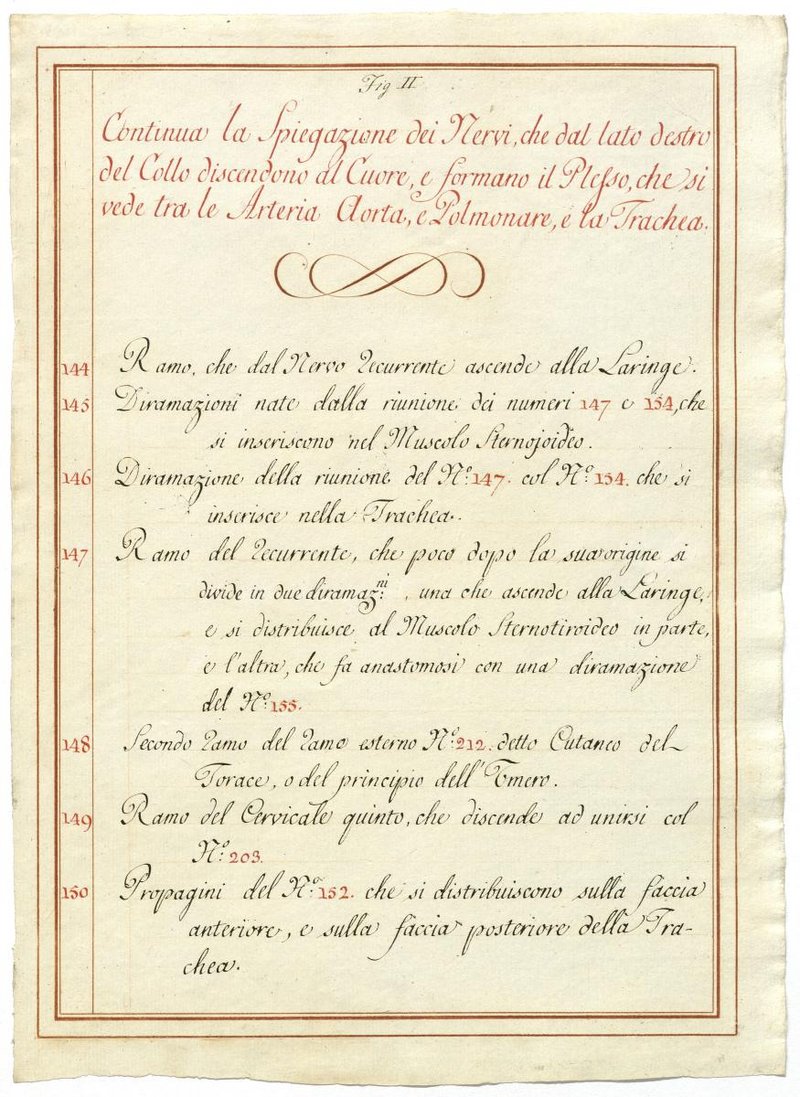 Der Text ist die ergänzende Beschreibung in italienischer Sprache zum anatomischen Wachsmodell des Plexus cervicalis, Nervus vagus und Nervus hypoglossus.