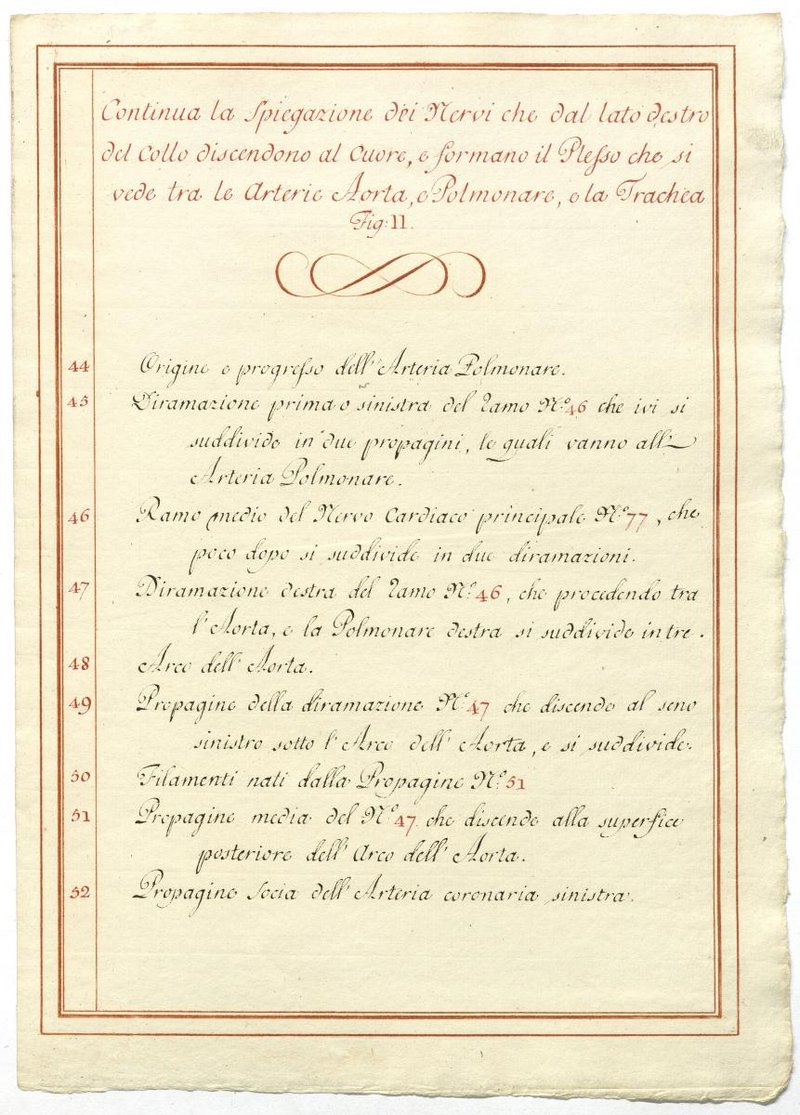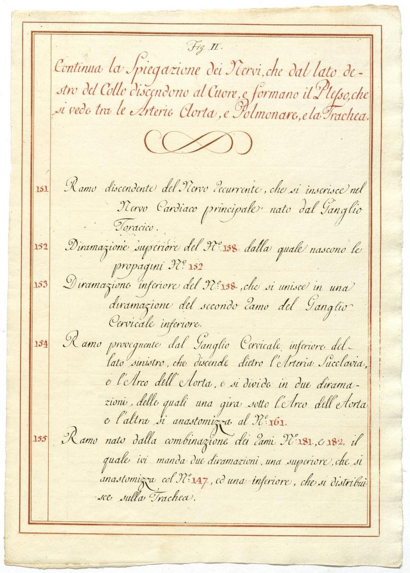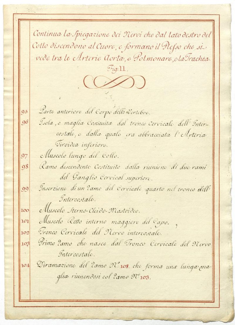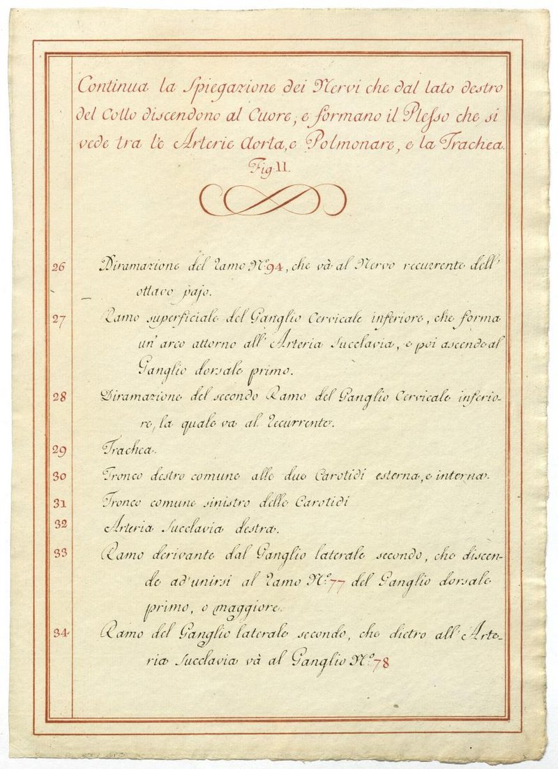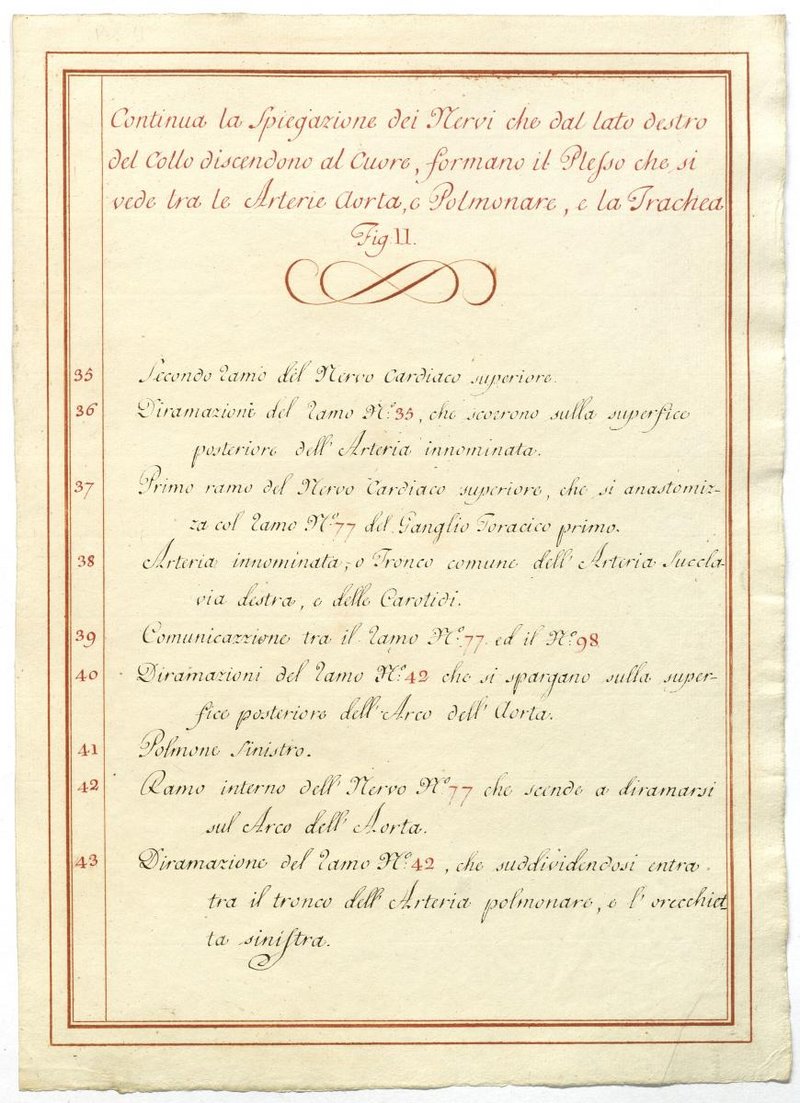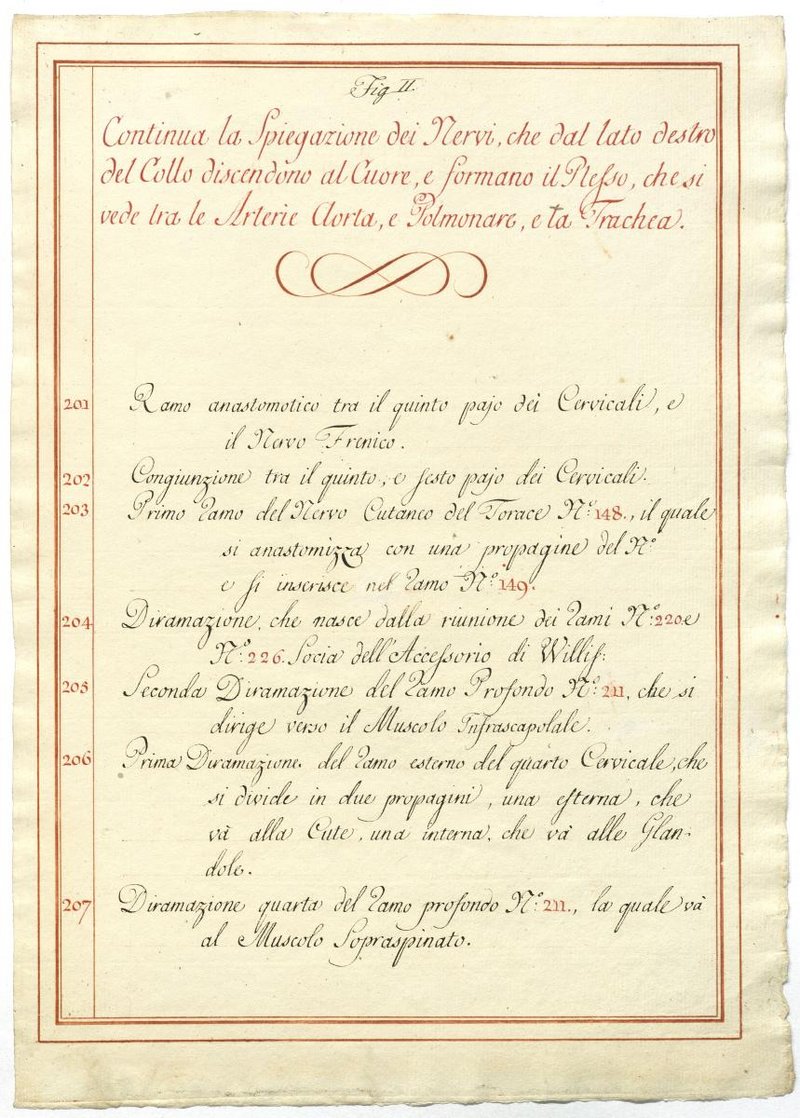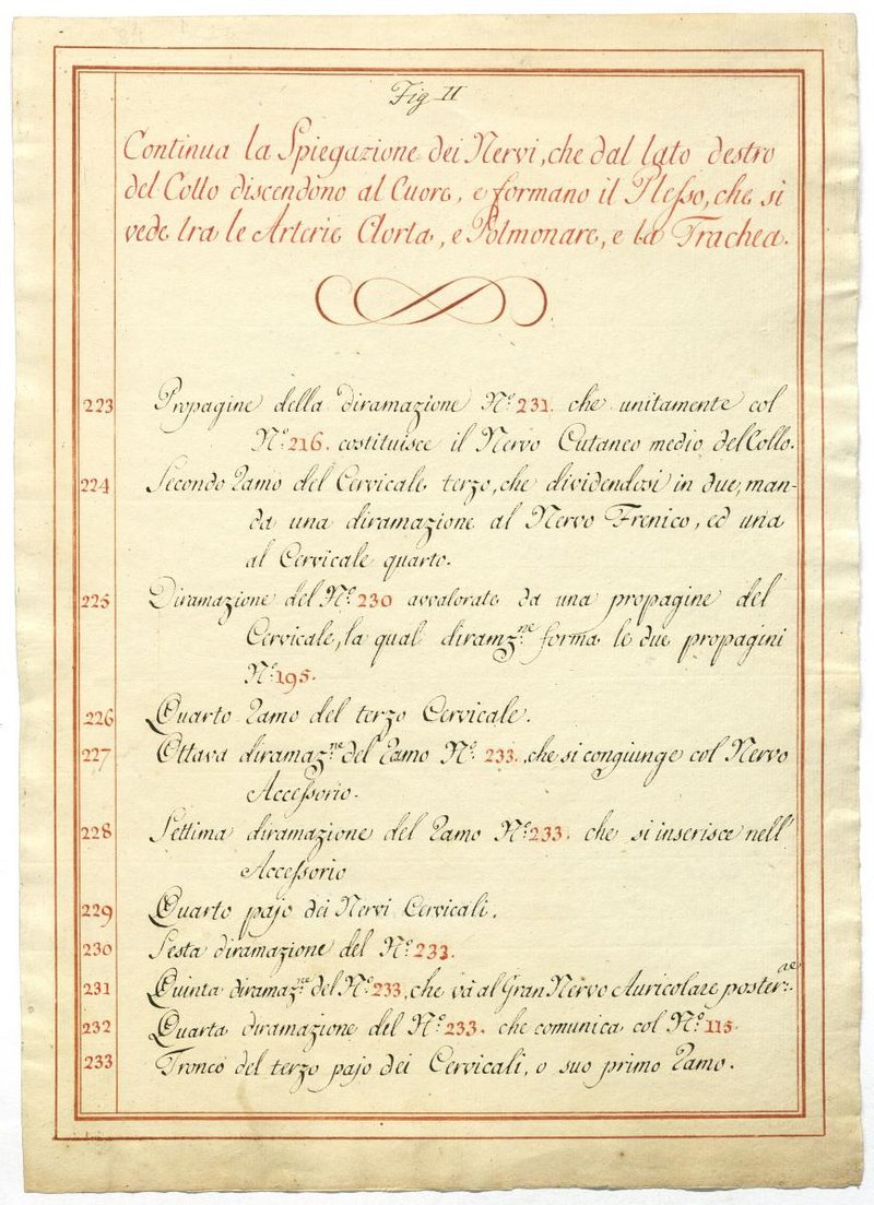 Der Text ist die ergänzende Beschreibung in italienischer Sprache zum anatomischen Wachsmodell des Plexus cervicalis, Nervus vagus und Nervus hypoglossus.