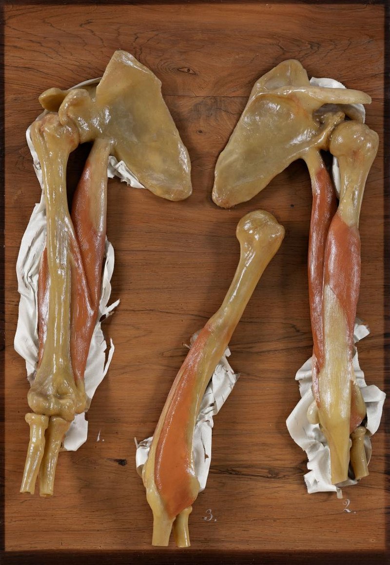 1. Schulterblatt (Scapula), Oberarmknochen (Humerus) und proximale Unterarmknochen – Elle (Ulna) und Speiche (Radius) – der rechten Seite von vorne. Musculus triceps brachii. 2. Schulterblatt (Scapula), Oberarmknochen (Humerus) und proximale Unterarmknochen – Elle (Ulna) und Speiche (Radius) – der rechten Seite von hinten. Musculus triceps brachii und Musculus anconeus. 3. Oberarmknochen (Humerus) und proximale Unterarmknochen – Elle (Ulna) und Speiche (Radius) – der rechten Seite von hinten. Medialer Kopf des Musculus triceps brachii.
