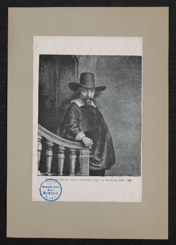 Es ist unklar, welcher Publikation das Bild entnommen worden ist. Die als Vorlage dienende Radierung wurde 1647 von Rembrandt angefertigt. Vorderseitig mit einem Stempel des Instituts für Geschichte der Medizin, Wien, versehen.