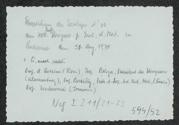 Neben Erna Lesky und Valriu Bologna sind außerdem Prof. Pazzini und Prof. Bariéty zu sehen. Neg. I 211/21-23