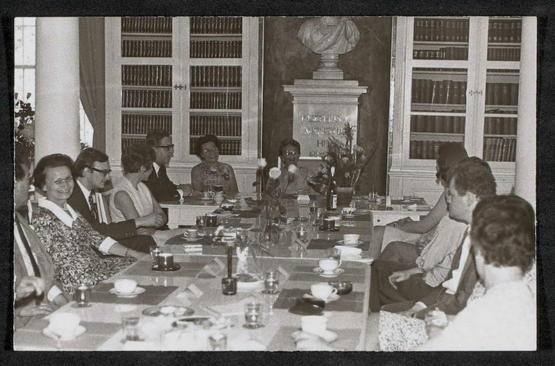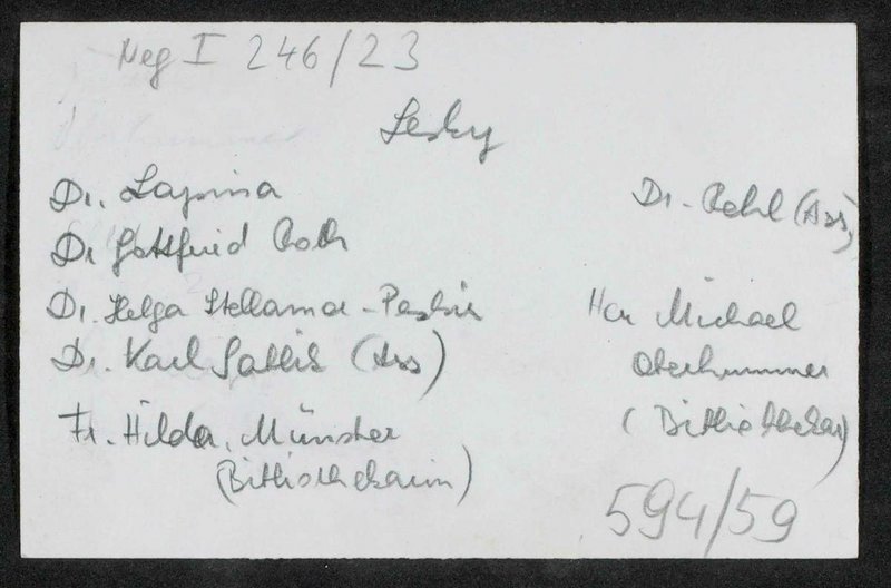 Abgebildet sind links: Dr. Lapina, Dr. Gottfried Roth, Dr. Helga Stellamor-Peskir, Dr. Karl Sablik, Hilda Münster; und rechts: Dr. Kohl, Michael Oberhammer. Neg. I 24-6/23