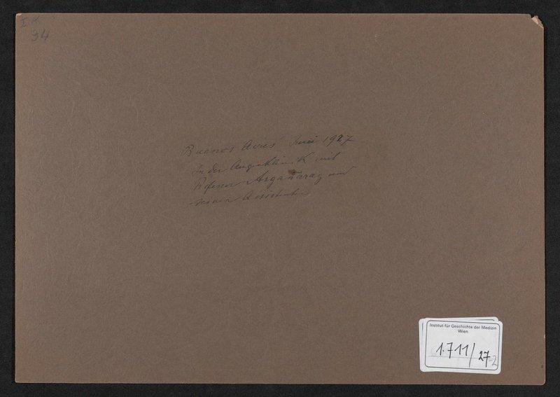 Die Fotografie wurde von Foto Disi Esmeralda, Buenos Aires, angefertigt. Rückseitig mit eigenhändiger Notiz von Ernst Fuchs, in der die Datierung der Fotografie von 1917 auf 1927 korrigiert worden ist. Neg. I 17/23, 24