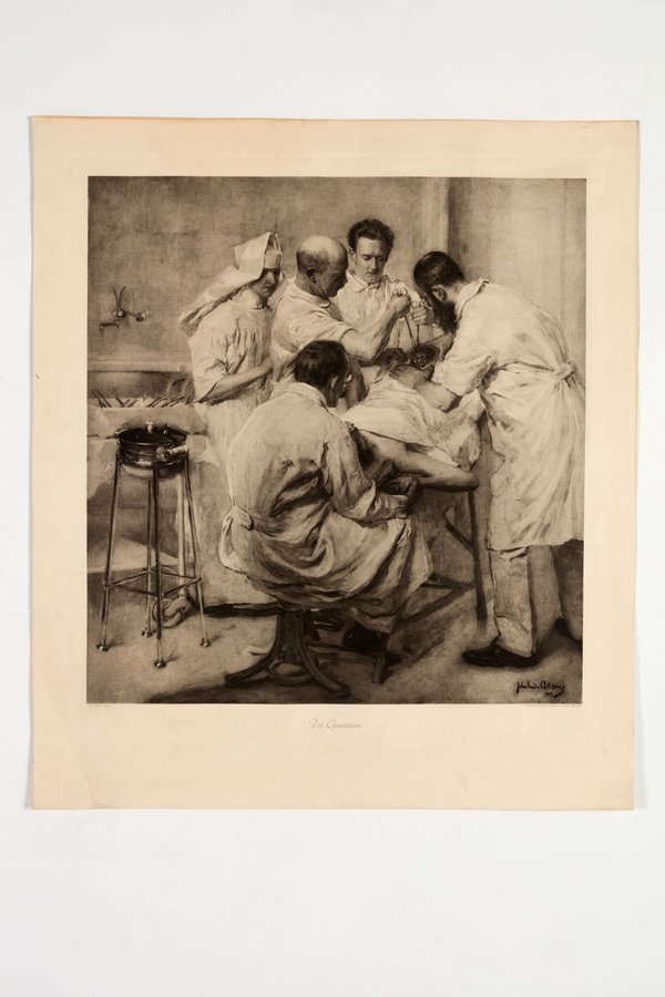 Lichtdruck des Gemäldes von John Quincy Adams, Die Operation, von 1907 durch Josef Löwy. Mit einem Stempel der Gesellschaft der Ärzte, Wien, auf der Rückseite. Neg. II 249 Neg. III. 1/8 Neg. I 121/15, 16 Neg. (9x12) 477, 478