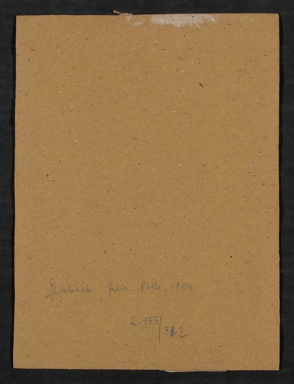 Das Zeichen ist auf der Rückwand eines Bilderrahmens angebracht. Dieser ist mit schwer leserlichen Informationen beschrieben, vermutlich zu einer Person, deren Porträt im Rahmen fixiert war.