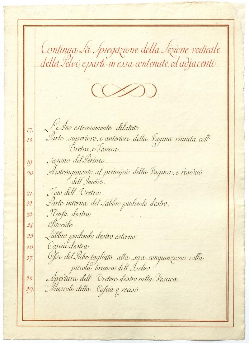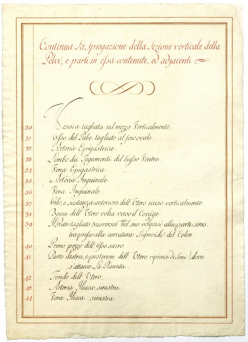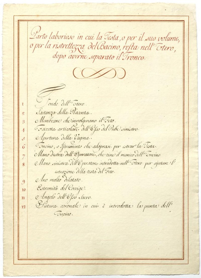 Der Text ist die ergänzende Beschreibung in italienischer Sprache zum anatomischen Wachsmodell unterschiedlicher Geburtenszenarien.