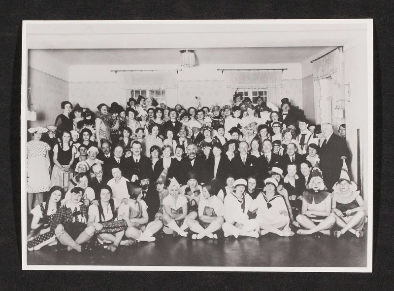 Reproduktion einer Fotografie von um 1929, die sich zum Zeitpunkt der Entstehung der Kopie im Besitz von Grete Mark befand. Die Schülerinnen persiflieren Julius Tandler (rechts von der Tafel), Direktor Baumgarten (1. von links) und Marianne Stein (im Kasperlgewand).