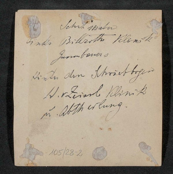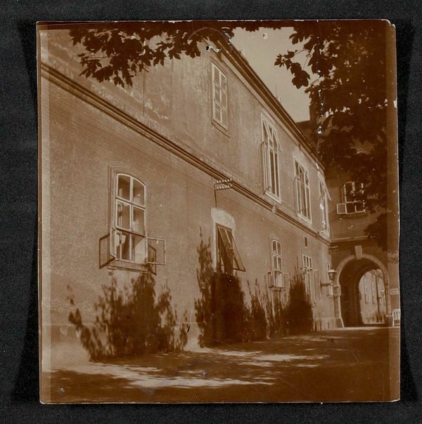 Laut rückseitiger Notiz sind auf der Fotografie die Klinik von Theodor Billroth bzw. Carl Gussenbauer sowie hinter dem Schwibbogen die Klinik von Hermann von Zeissl zu sehen.