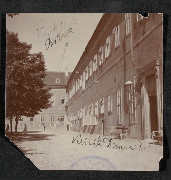 Laut Notizen auf der Vorderseite sind auf der Fotografie die Klinik von Theodor Billroth und Johann von Dumreicher zu sehen.