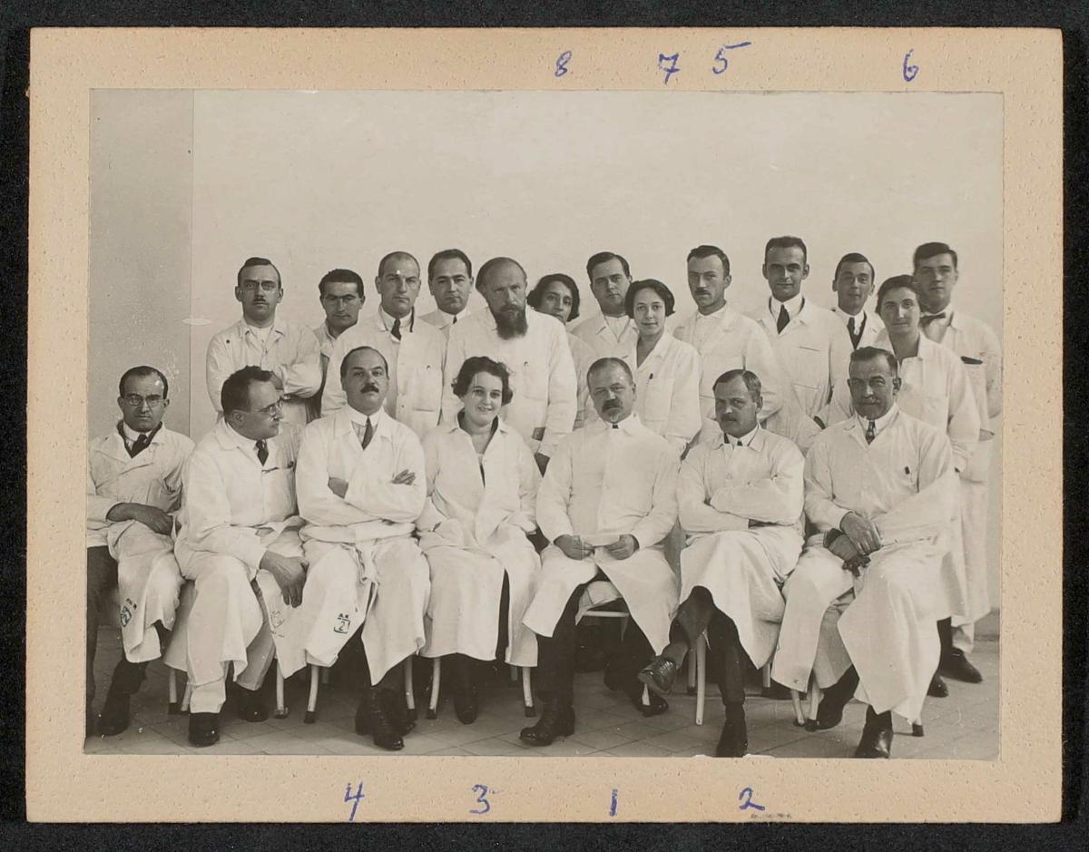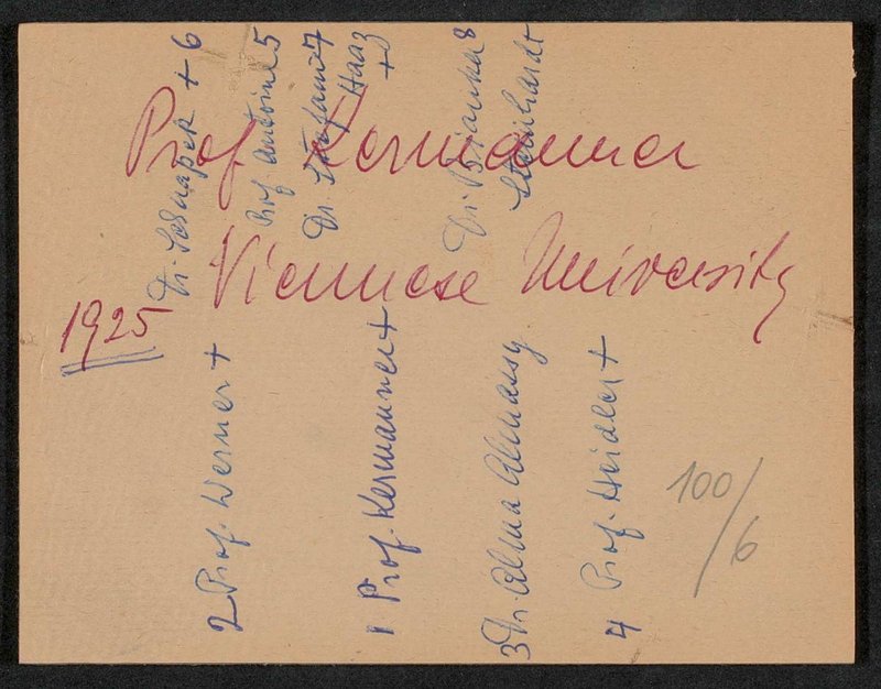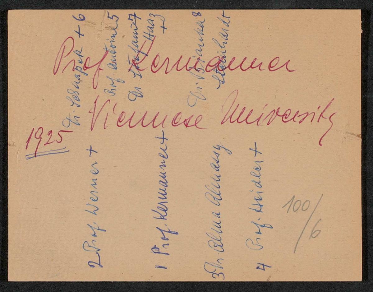 Zu sehen sind u.a.: 1. Fritz Kermauner, Prof. Dr.; 2. Paul Werner, Prof. Dr.; 3. Alma Almassy, Dr.; 4. Hans Heidler, Prof. Dr.; 5. Tassilo Antoine, Prof. Dr.; 6. Herr Schnaper, Dr.; 7. Stefanie Haaz, Dr.; 8. Bianka Steinhardt, Dr.